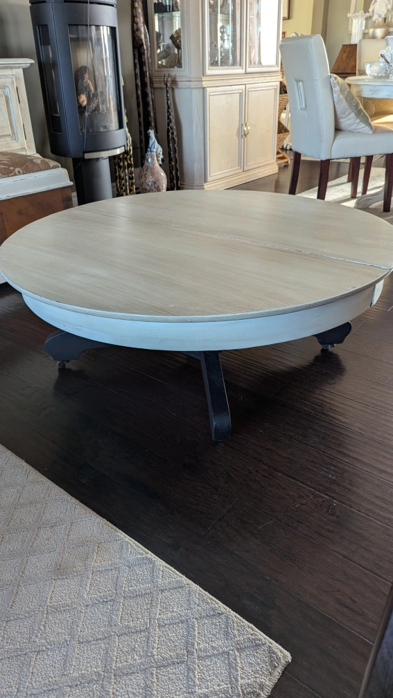 Large round coffee table. Off-white top. Black pedestal base. Unique design. Good condition.Formerly a dining table converted into a coffee table.Pick up in Lindsay.Sale pending till tomorrow