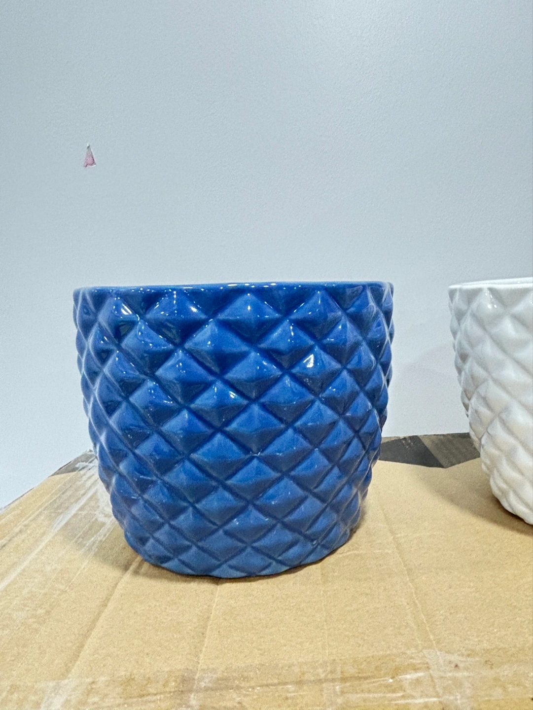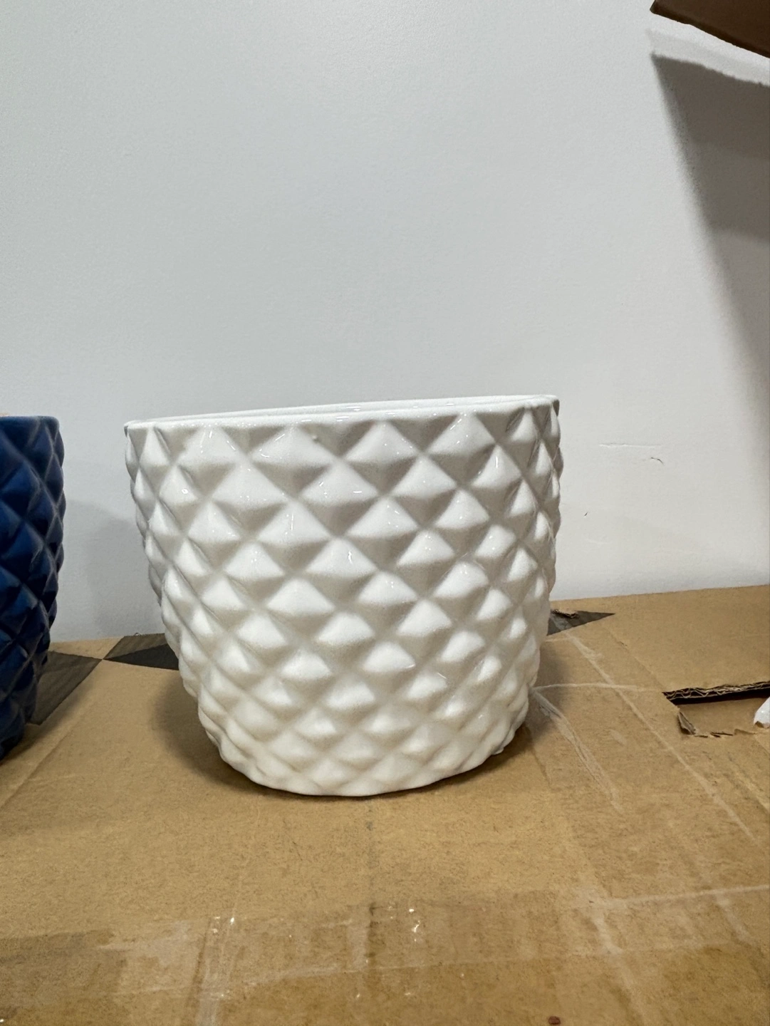 Two round ceramic planters. Geometric textured design. 5" bottom to 6-1/2" top circumference . Excellent for indoor plants. I have 4 blue and 10 white.