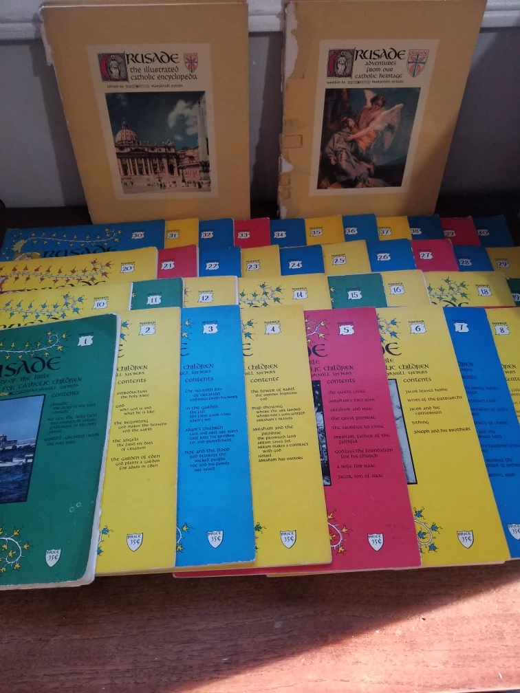 Almost complete set of vintage Crusade v.13 and v.17 are missing. I did have all of them at one point so I will give them when / if they pop up. . Includes two hard cover volumes. Excellent resource for religious education or collectors.