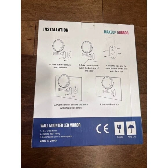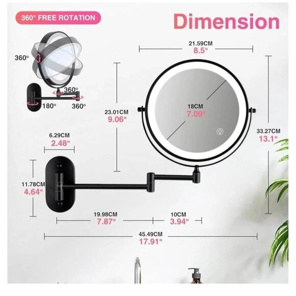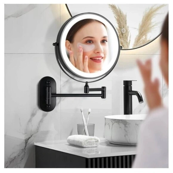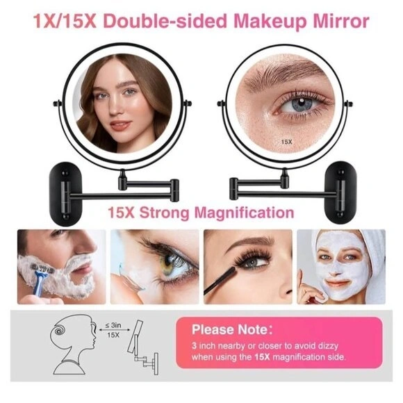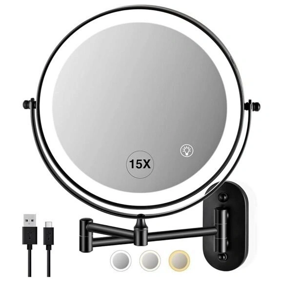 This is a new, wall-mounted makeup mirror with LED lights. It features three color temperatures (daylight, warm, cool) for different lighting needs. The extendable arm allows for flexible adjustment of angle and distance. It offers 1x and 15x magnification for detailed grooming. The mirror has a built-in 2000mAh rechargeable battery with Type-C fast charging. Its elegant design makes it a nice addition to any home.