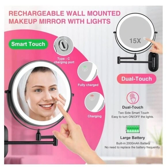 Mirror with Lights 1x/15x Rechargeable 8.5in Wall Mounted Makeup