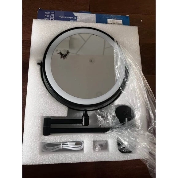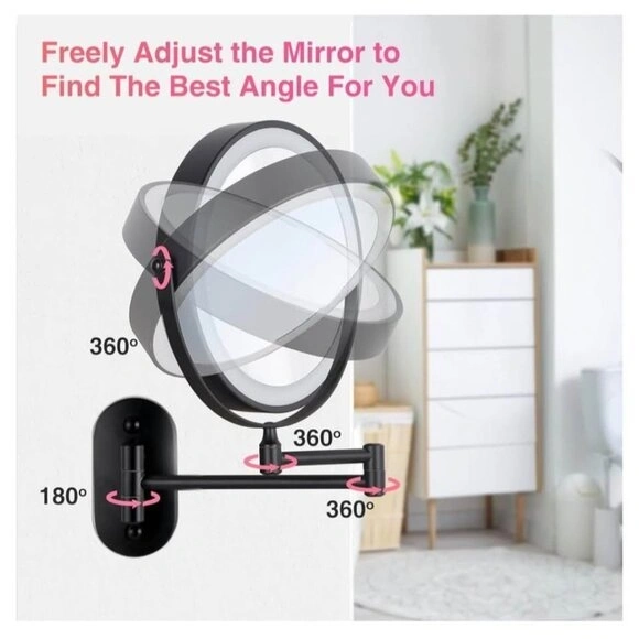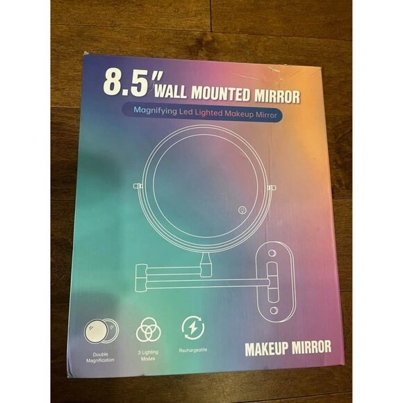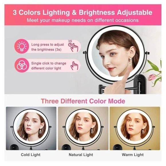 This is a new, wall-mounted makeup mirror with LED lights. It features three color temperatures (daylight, warm, cool) for different lighting needs. The extendable arm allows for flexible adjustment of angle and distance. It offers 1x and 15x magnification for detailed grooming. The mirror has a built-in 2000mAh rechargeable battery with Type-C fast charging. Its elegant design makes it a nice addition to any home.
