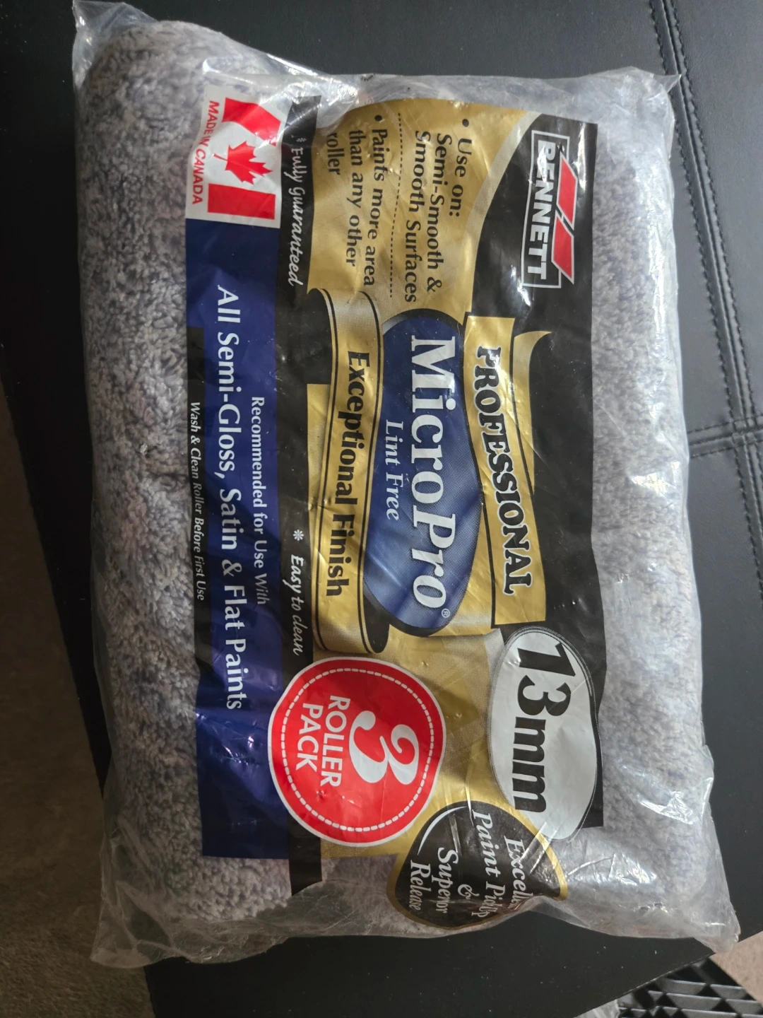 Selling a pack of Bennett Micro Pro paint rollers! This is a 3-roller pack, perfect for your painting needs. They are lint-free and designed for a smooth, exceptional finish on semi-smooth and smooth surfaces. Great for all semi-gloss, satin, and flat paints
