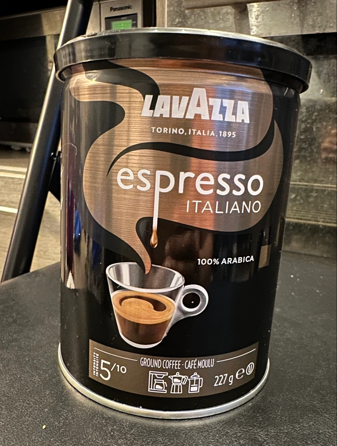 227g can of Lavazza Espresso Italiano. 100% Arabica beans. Ground coffee.