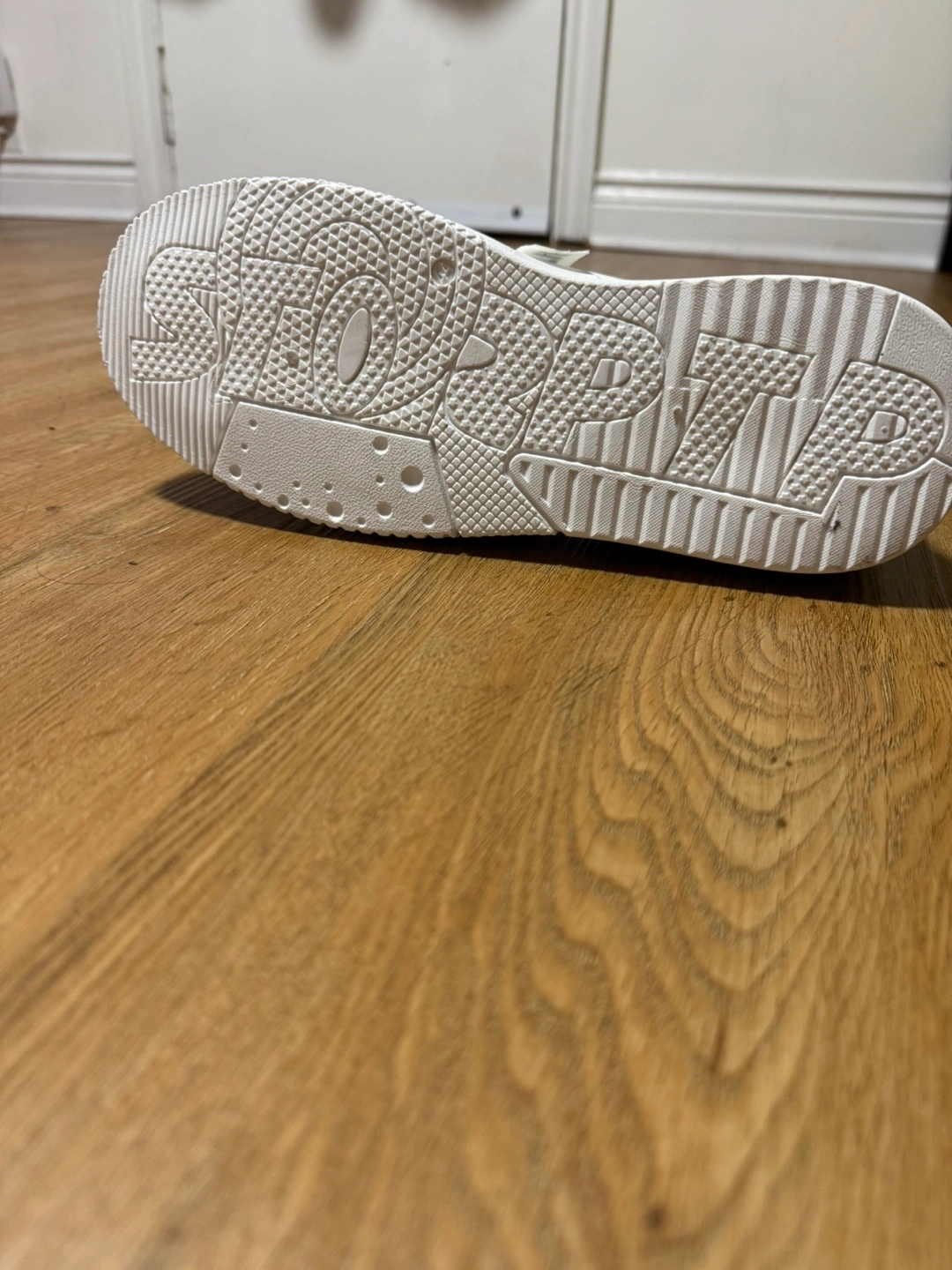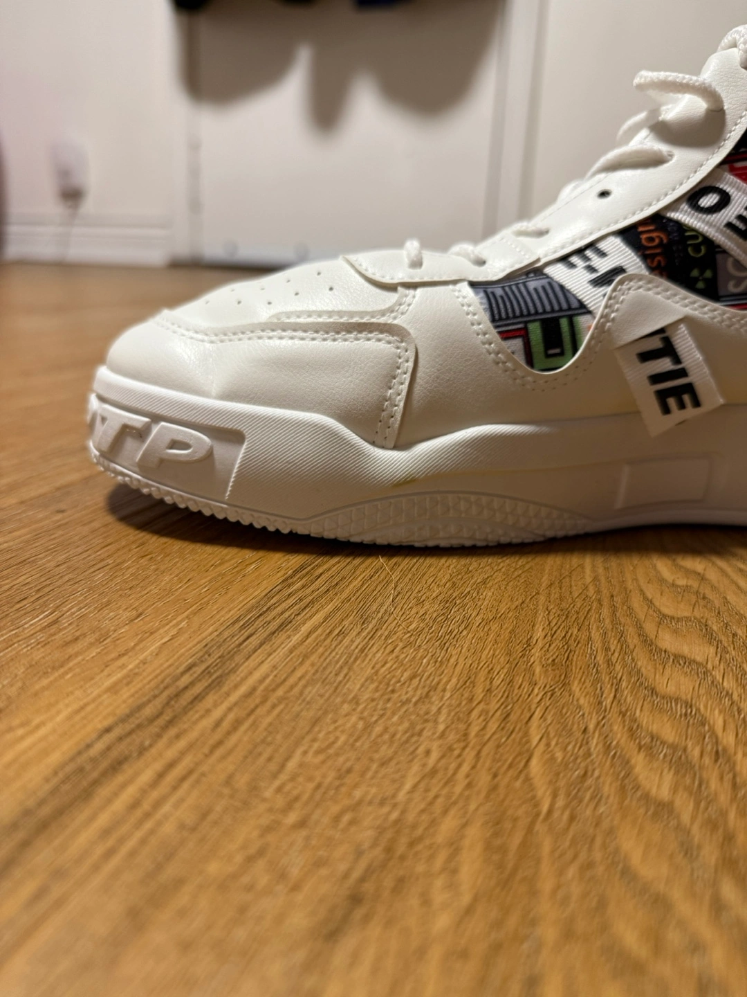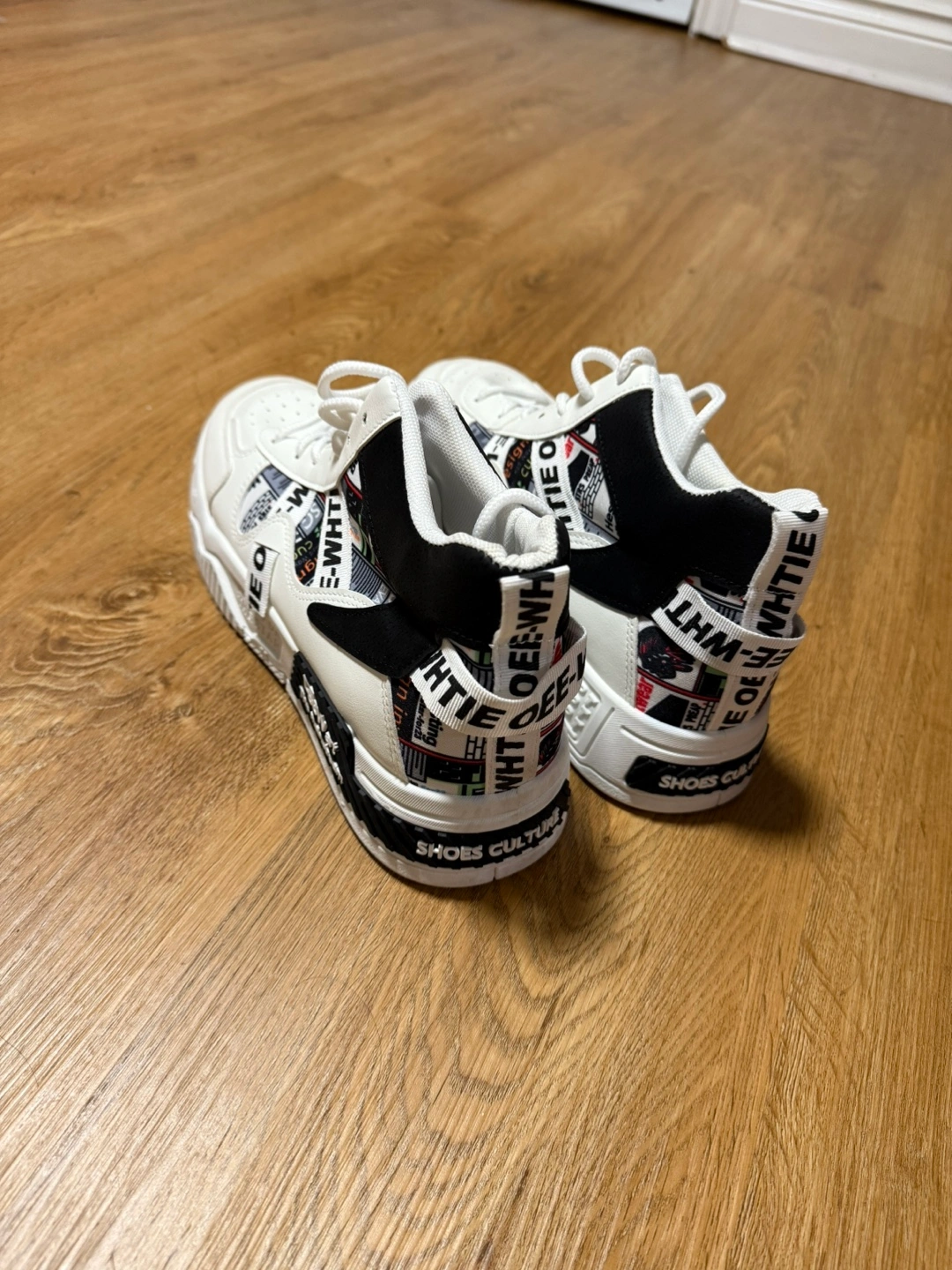 White high-top sneakers. Chunky sole. Black and white accents. Text detailing on the side. Size not specified.
