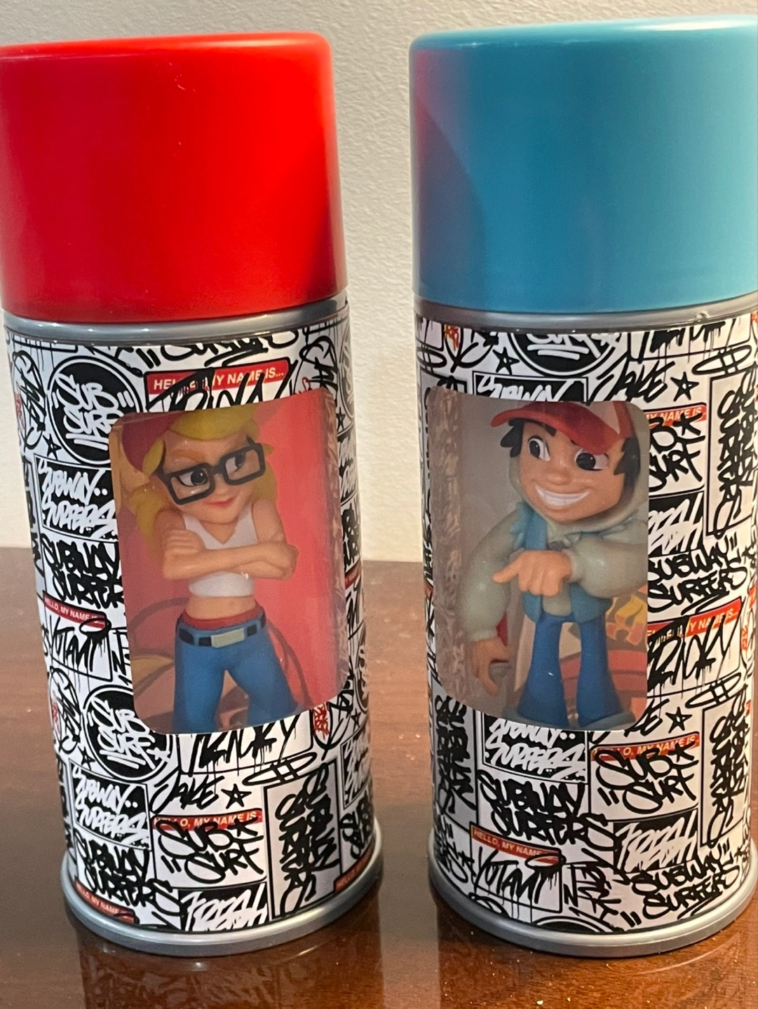 Pair of Subway Surfers themed spray paint cans. Each can features a unique character figurine inside a window. Collectible items, great for fans.