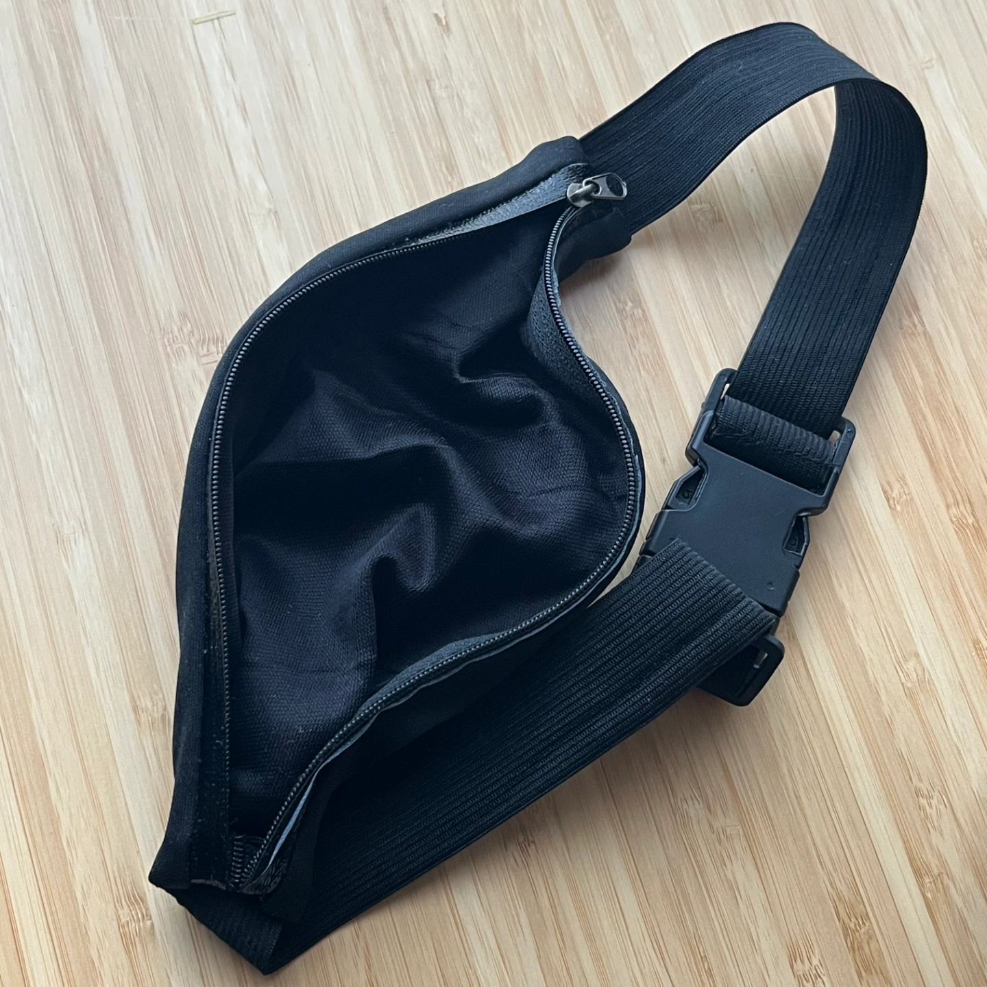 Adjustable waist belt. Features a zippered pocket. Great for running or other activities. Black fabric and elastic straps. Plastic buckle closure.