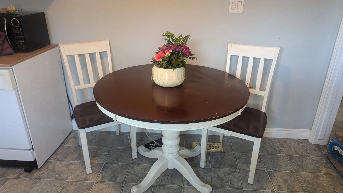 Round table with dark brown top and white pedestal base. Includes four matching chairs with white frames and dark brown seats. Good for small spaces.