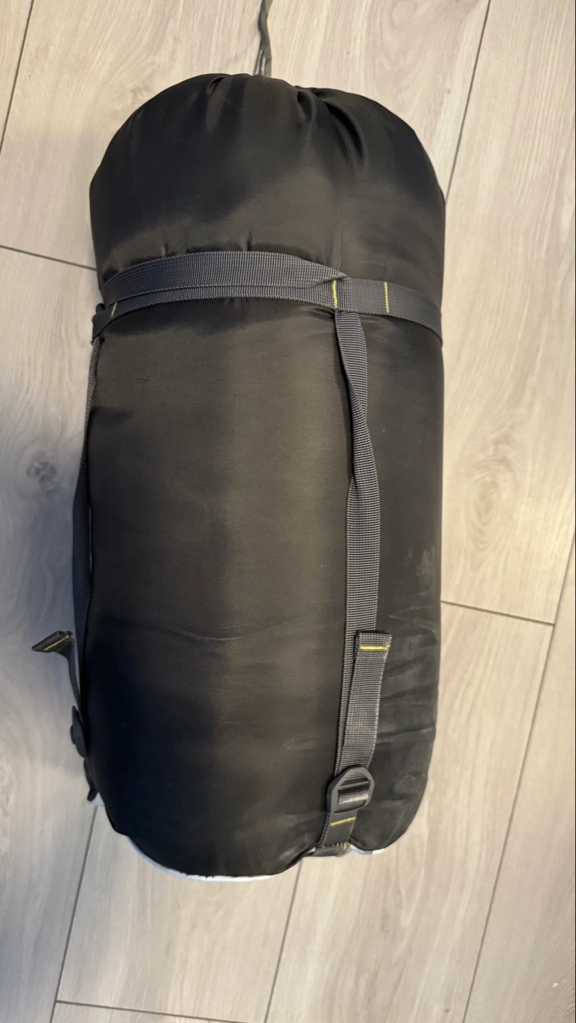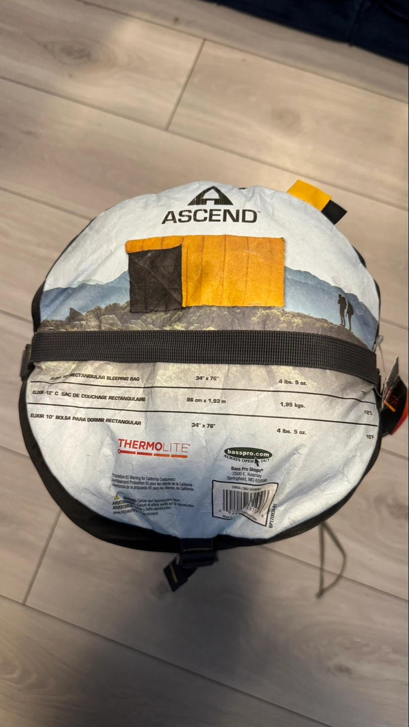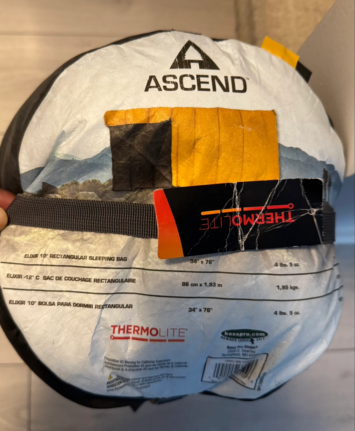 Rectangular sleeping bag. Thermolite insulation, very warm. Great for camping. Measures 34" x 76". Weighs 4 lbs 5 oz. Compact storage. Like new condition.