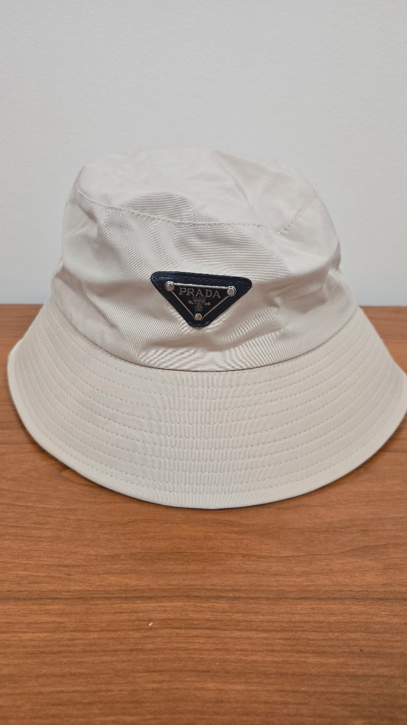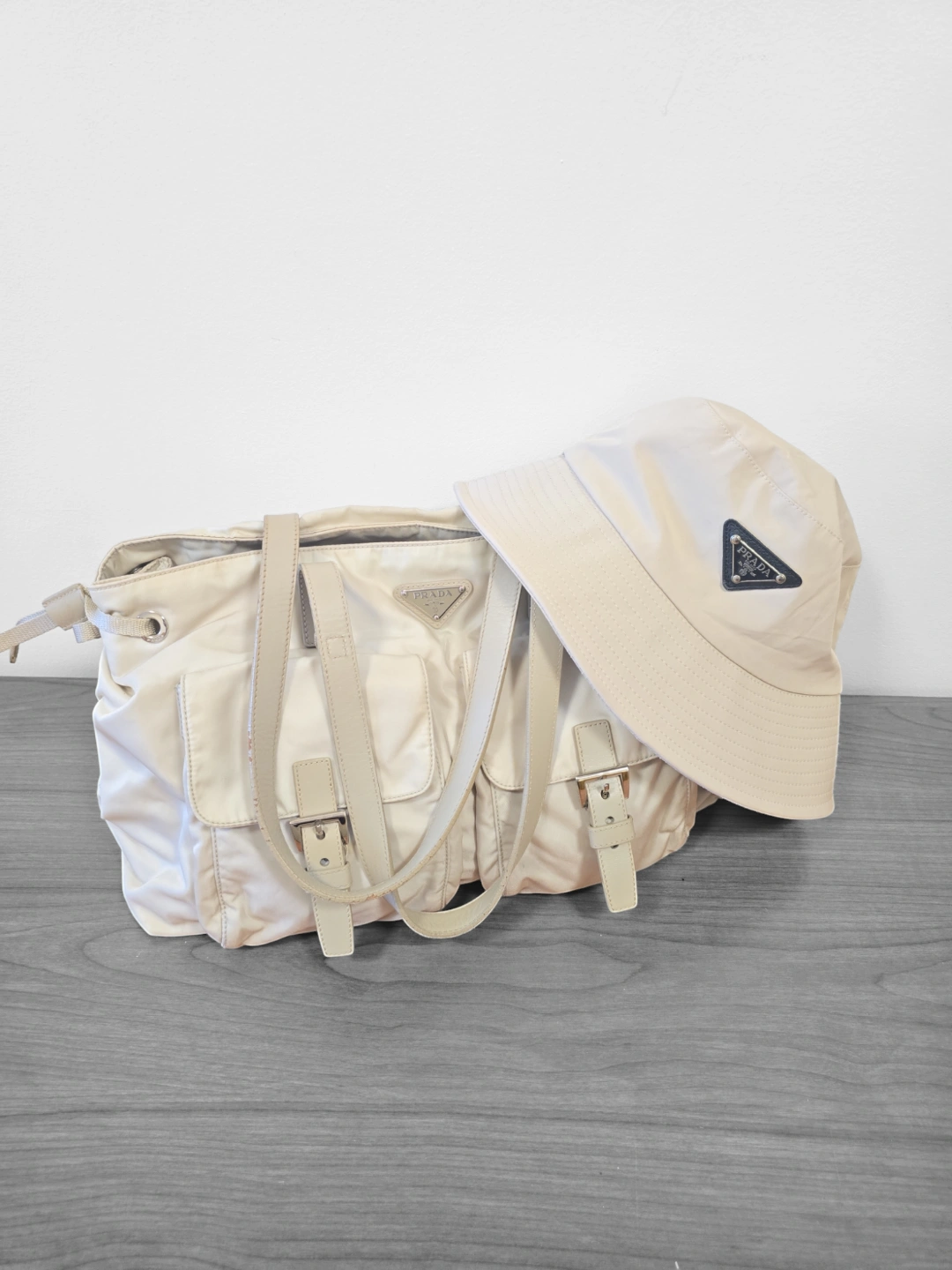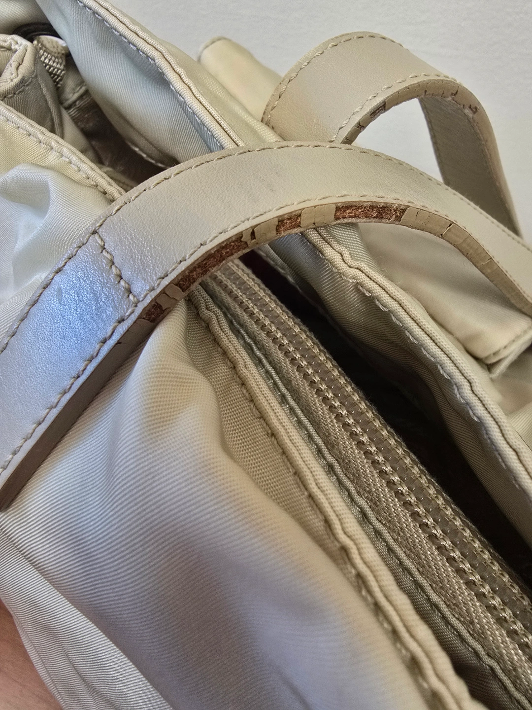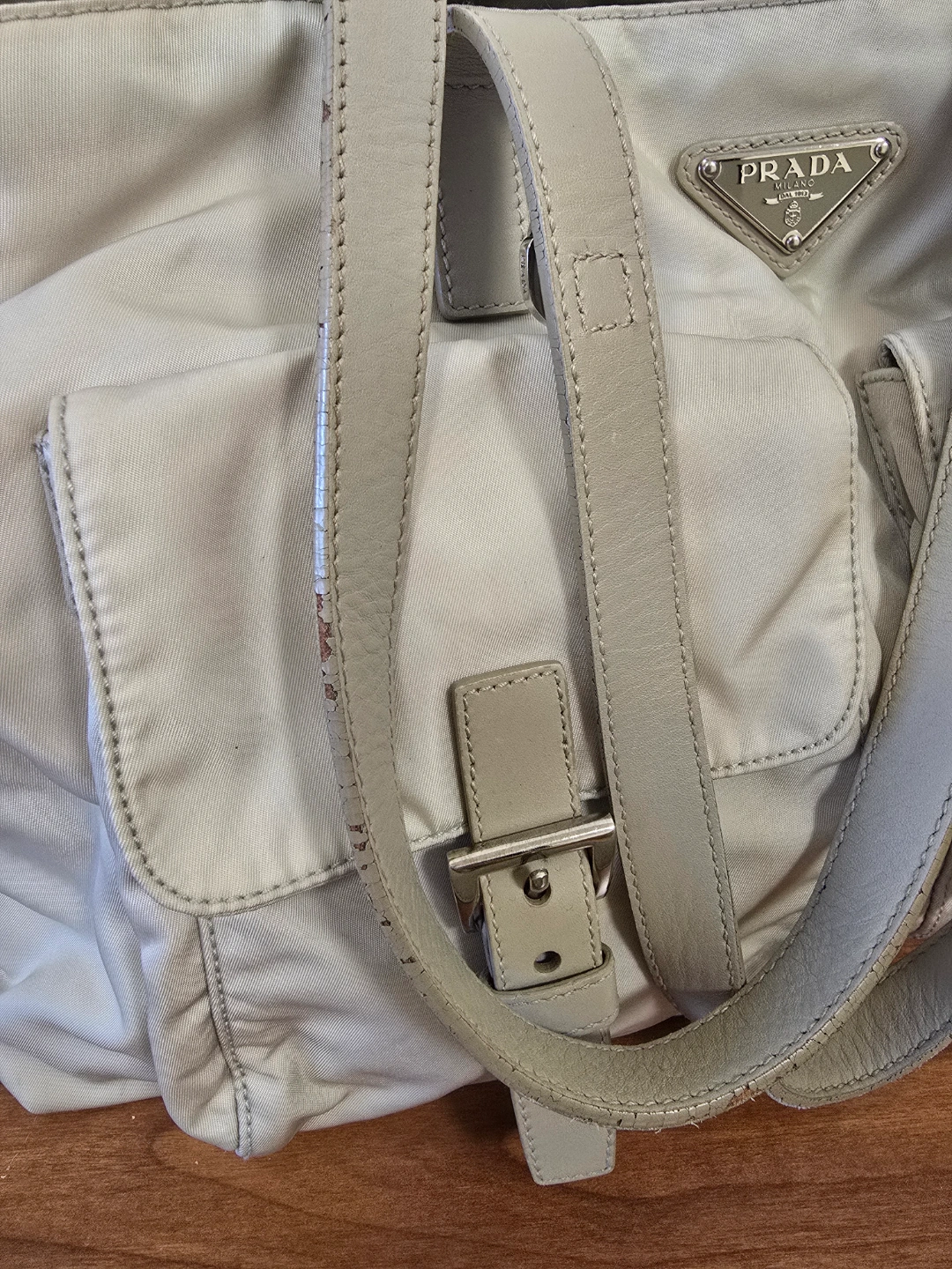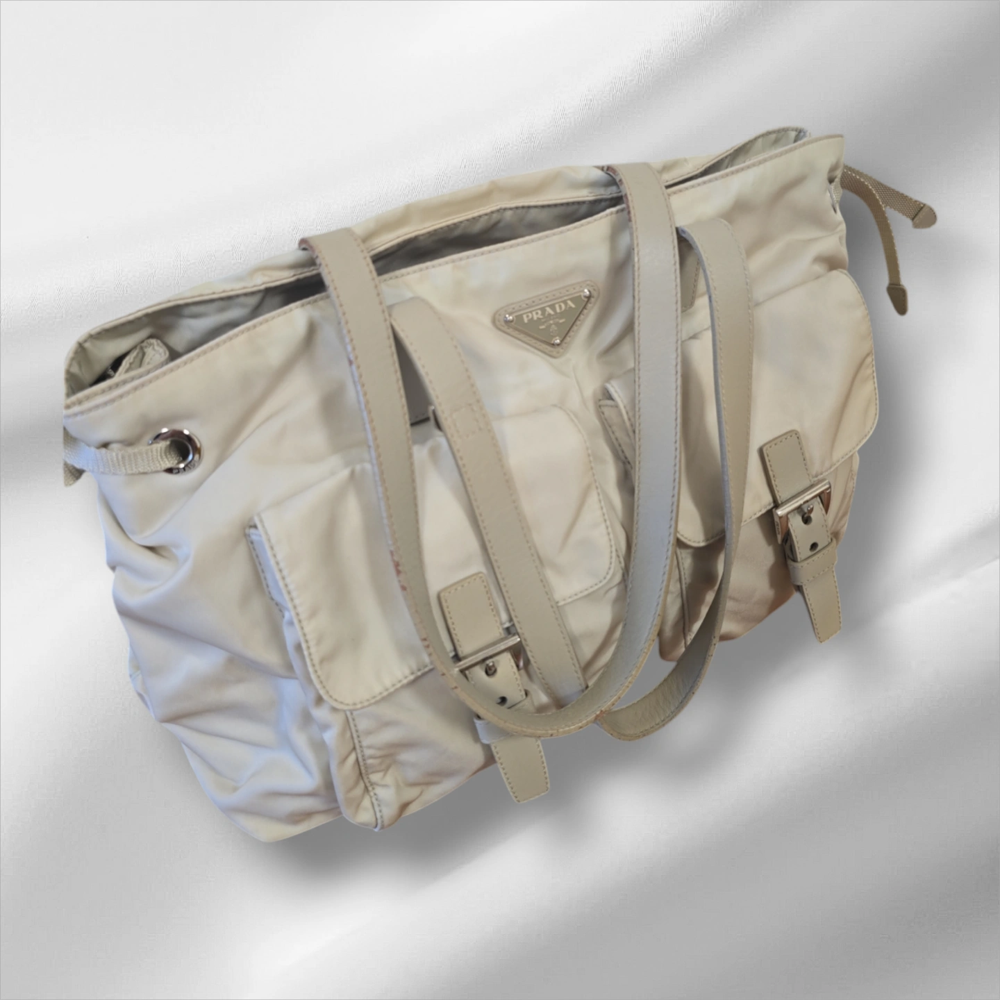 Pre-owned Prada tote bag. Beige nylon material. Leather accents. Multiple pockets. Shoulder straps. Shows some wear.