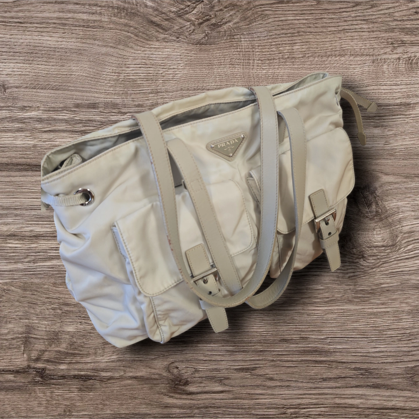 Pre-owned Prada tote bag. Beige nylon material. Leather accents. Multiple pockets. Shoulder straps. Shows some wear.