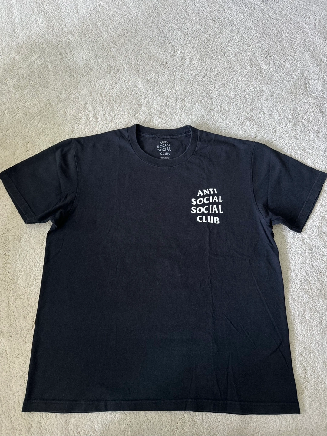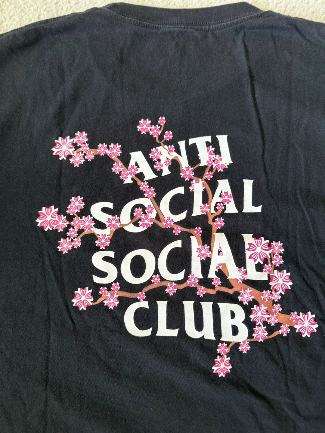 Black Anti Social Social Club t-shirt. Features a cherry blossom branch design on the back. Made in the U.S.A. 100% cotton.