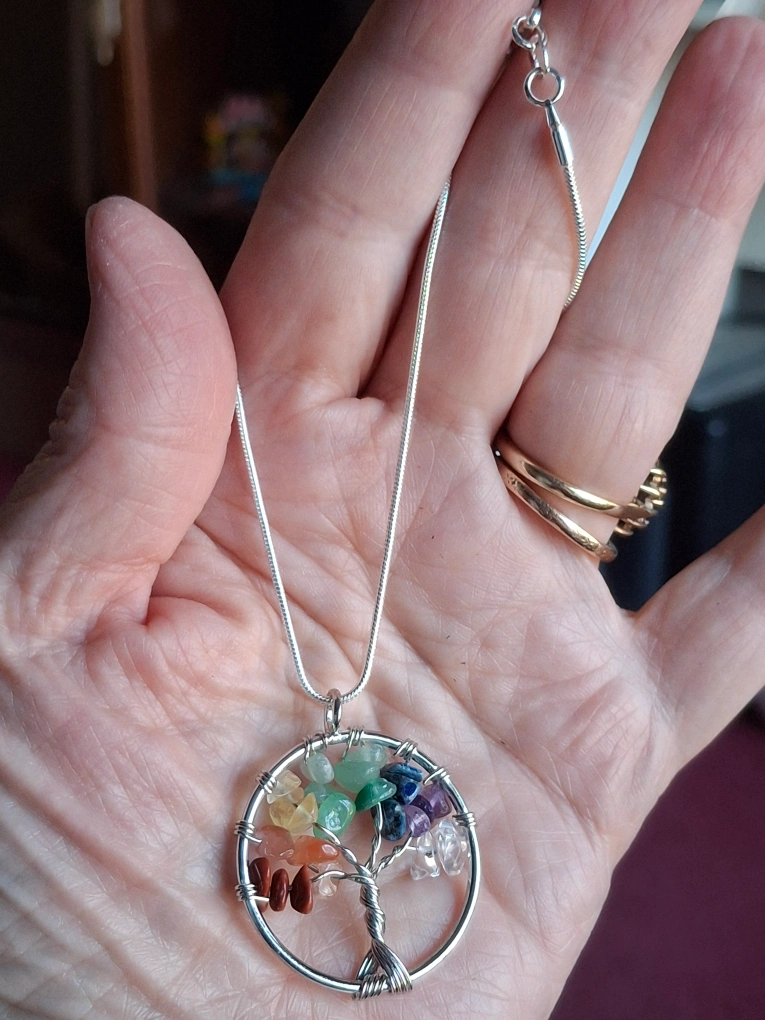 Selling a lovely tree of life necklace! It features a silver pendant with colourful semi precious stones arranged in the shape of a tree. The necklace has a delicate silver plated chain.