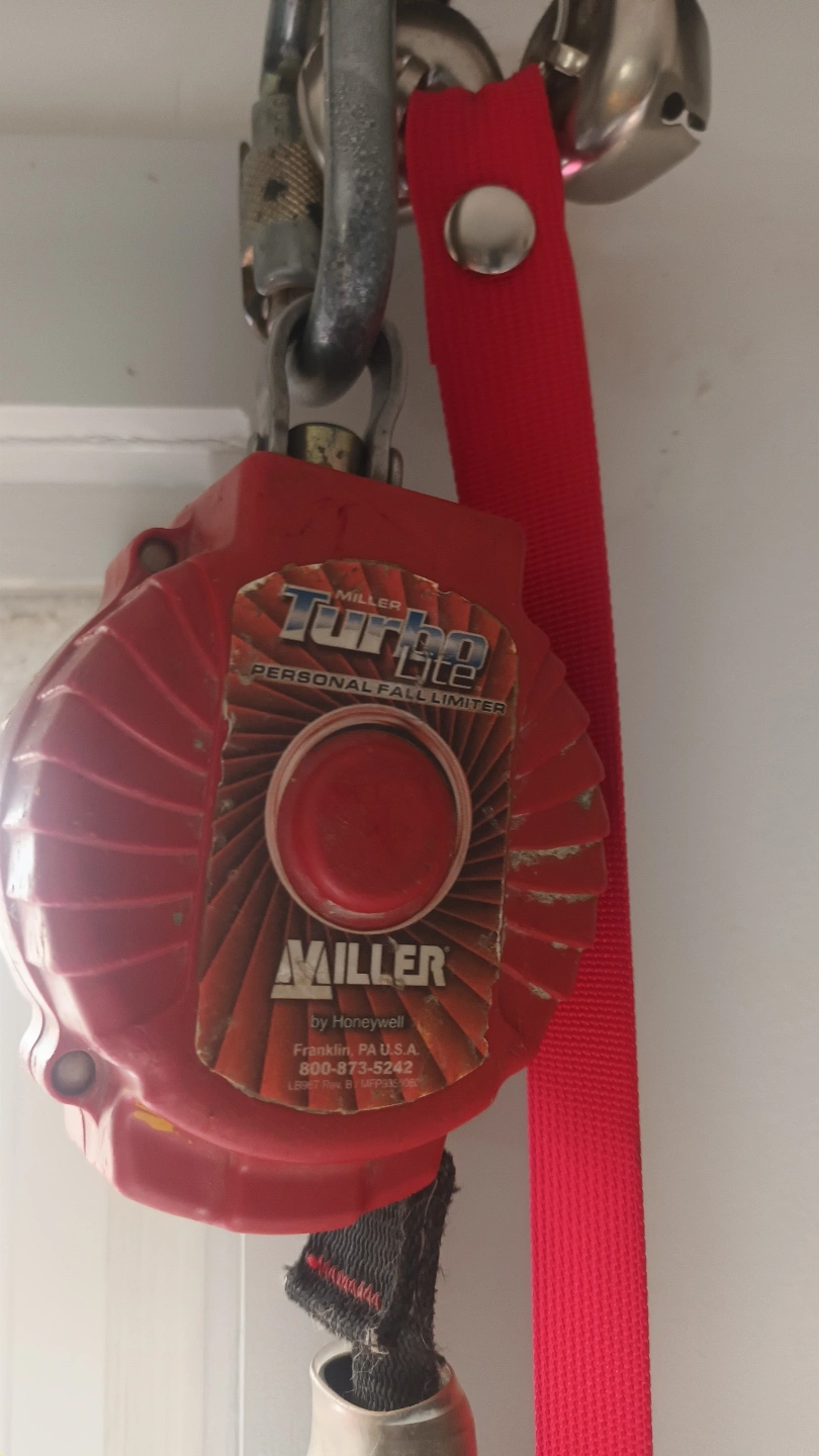 Used Miller Turbo Personal Fall Limiter. Red casing. Includes webbing and connectors. Shows some wear. Willing to trade for PPE or Carpenter Tools. Go oilers go.