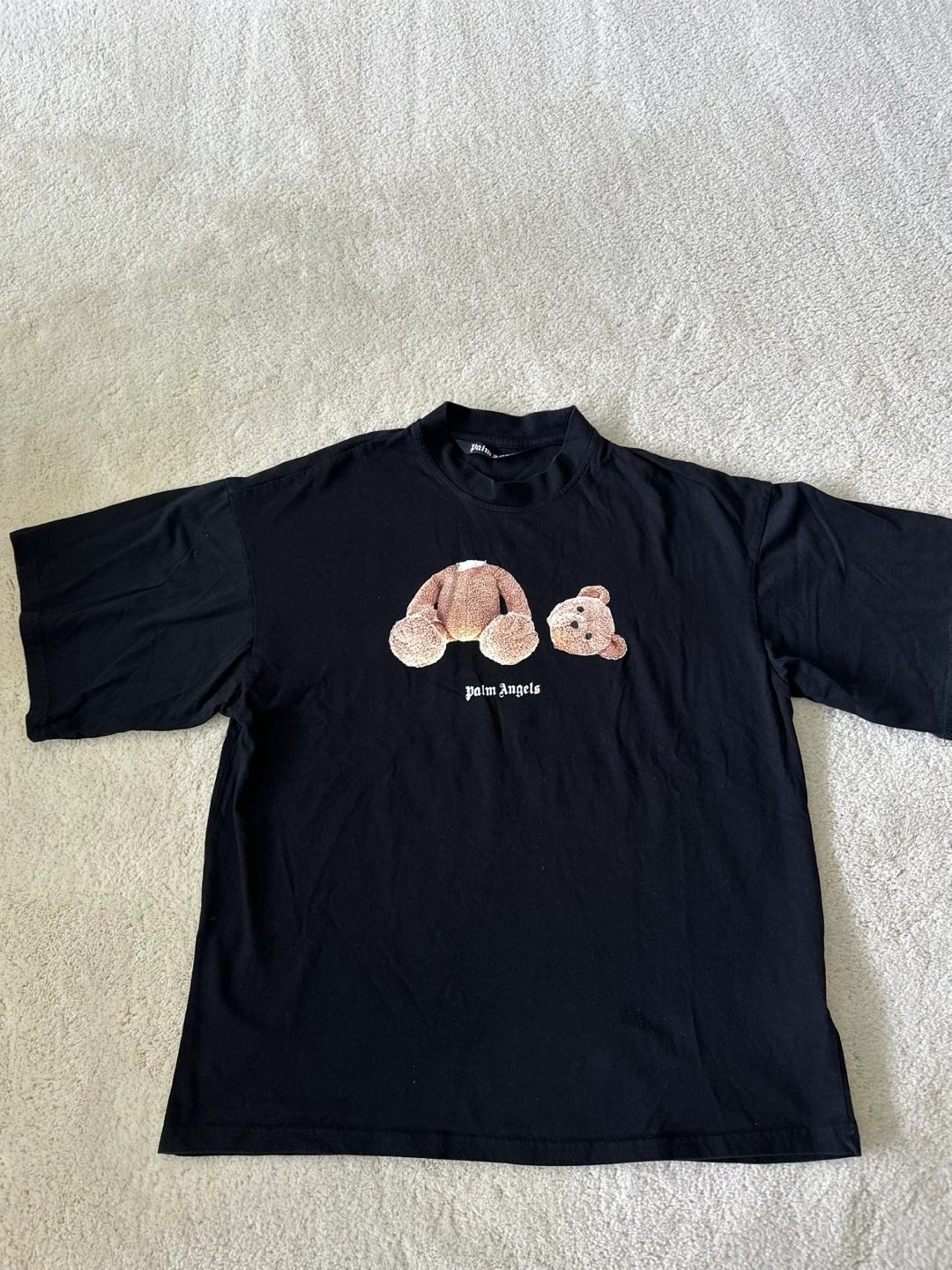 Black Palm Angels t-shirt. Features a graphic of a bear on the front and Palm Angels text on the back. Short sleeves. Made in Portugal.