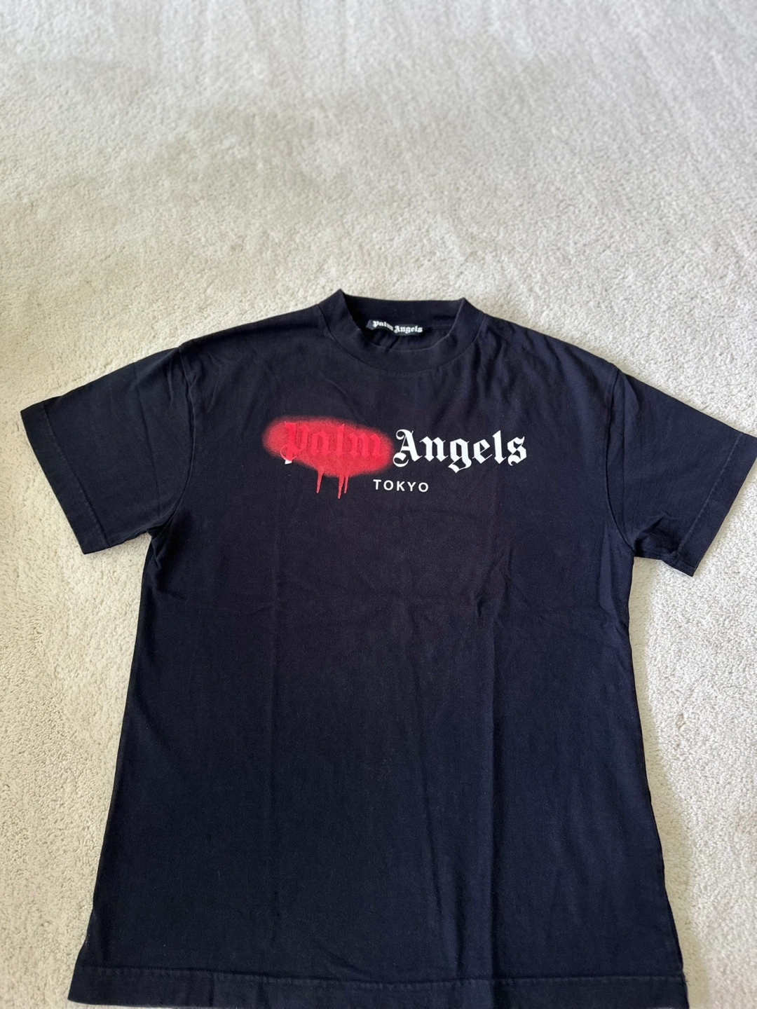 Black Palm Angels t-shirt. Features a red spray paint graphic with "Palm Angels Tokyo" text. Men's size medium. 100% cotton.