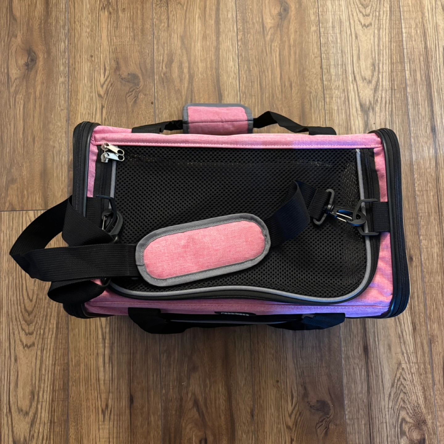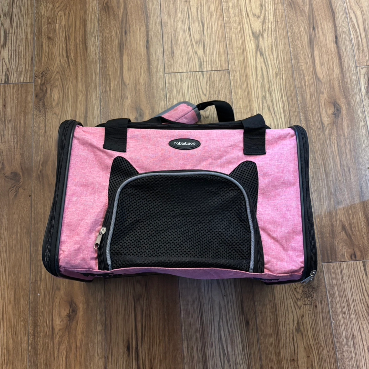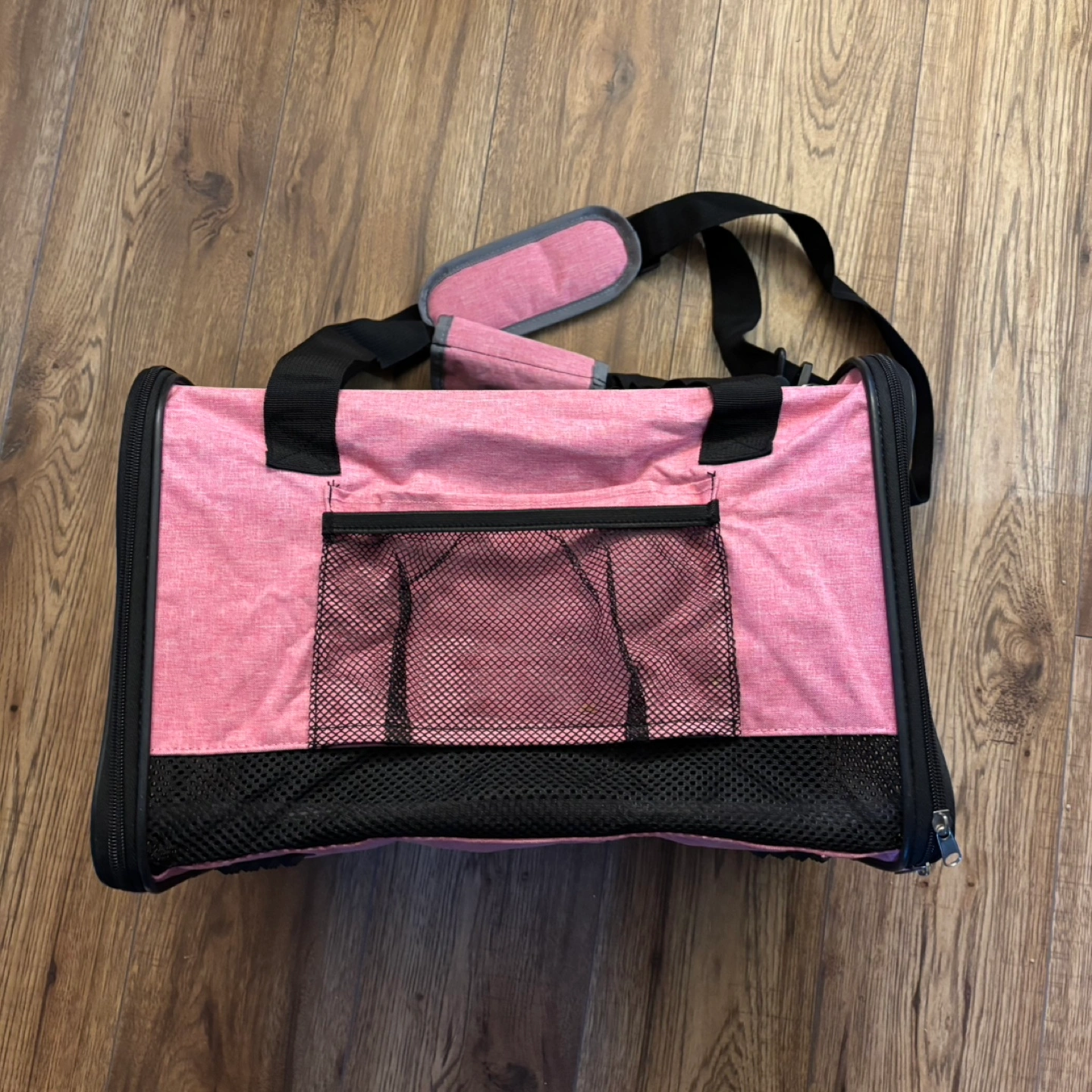 132Adorable pink pet carrier. Features a mesh window, shoulder strap, and small storage pocket. Perfect for small animals. CASH ONLY