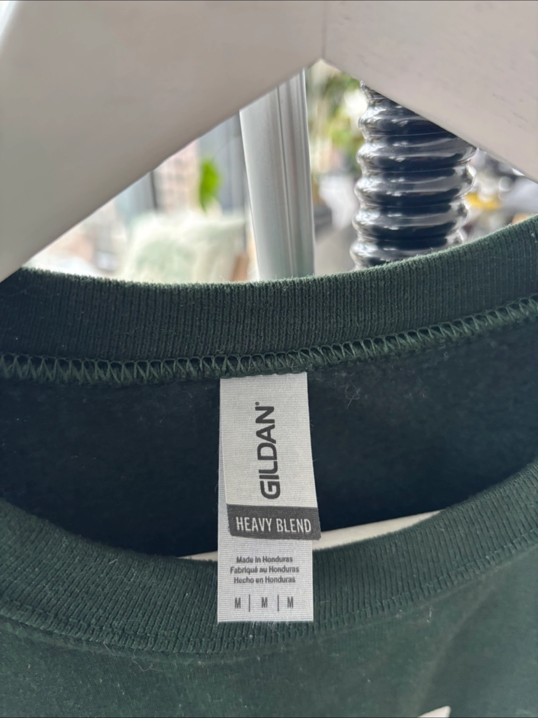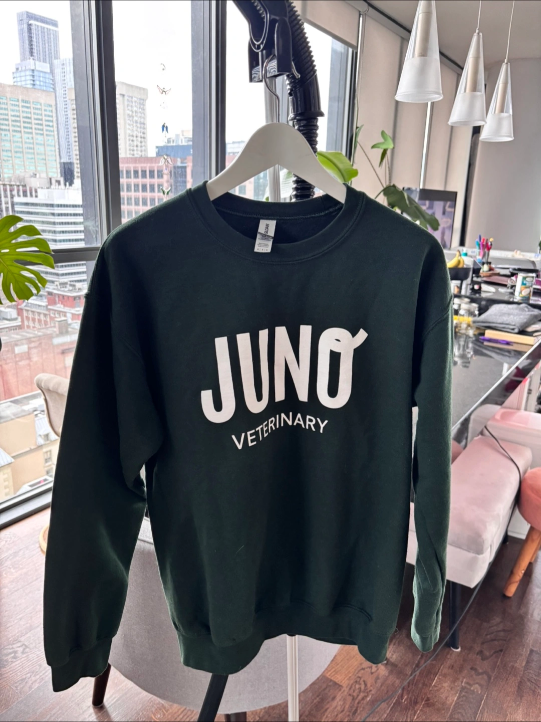 Green Juno Veterinary crewneck sweatshirt. Medium Gildan heavy blend. Simple design, comfortable fit.