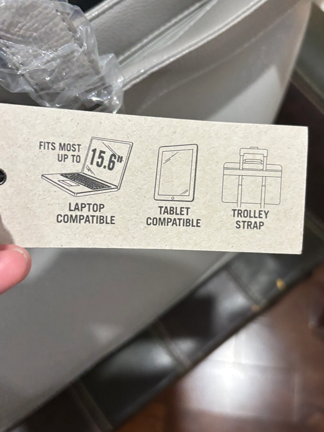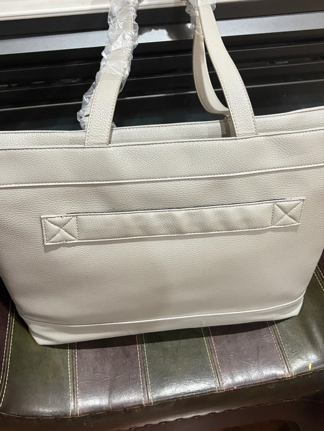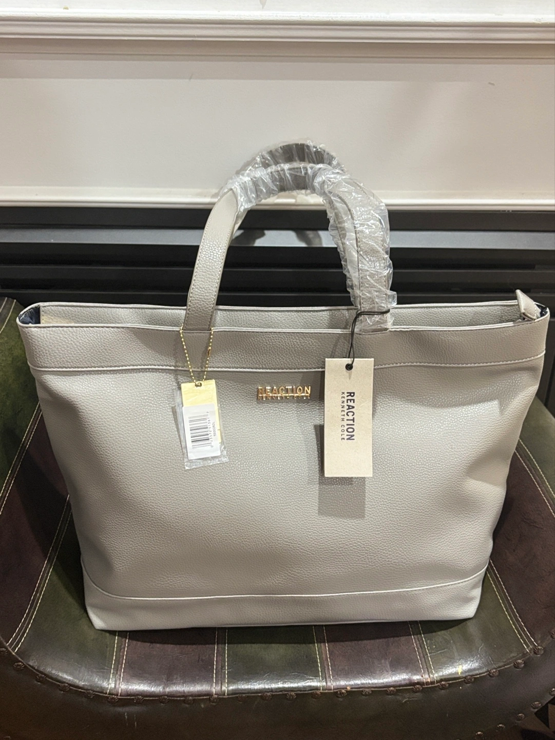 Large grey tote bag. Features zipper closure, interior pocket, and trolley strap. Laptop and tablet compatible. New with tags.