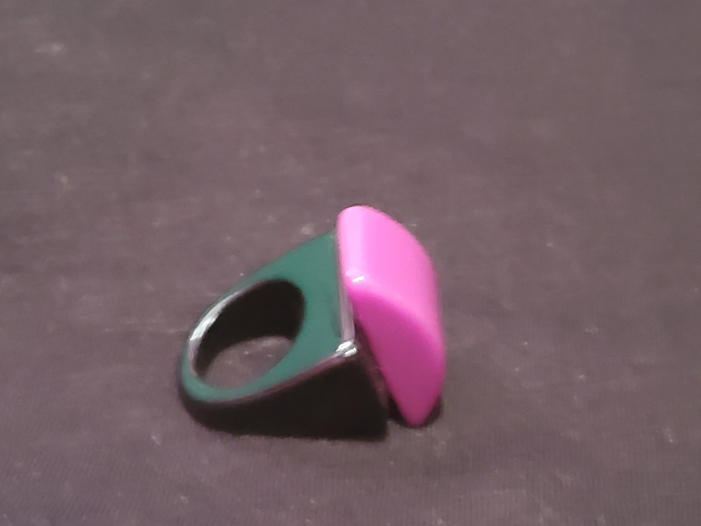 Bold ring features a vibrant purple and black design. Modern style. Eye-catching accessory.