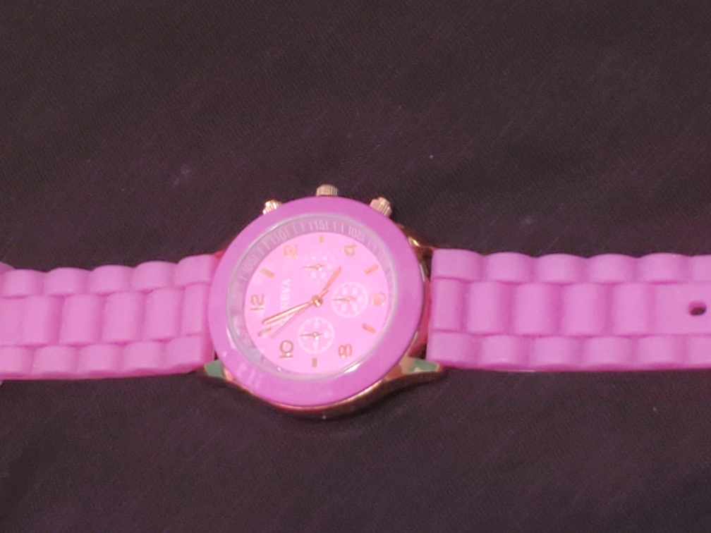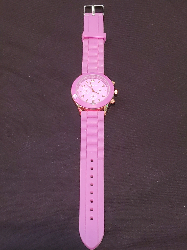 Stylish wristwatch. Features a purple coloured case and accents. Purple silicone band. Quartz movement. Stainless steel back. Gold accents.
