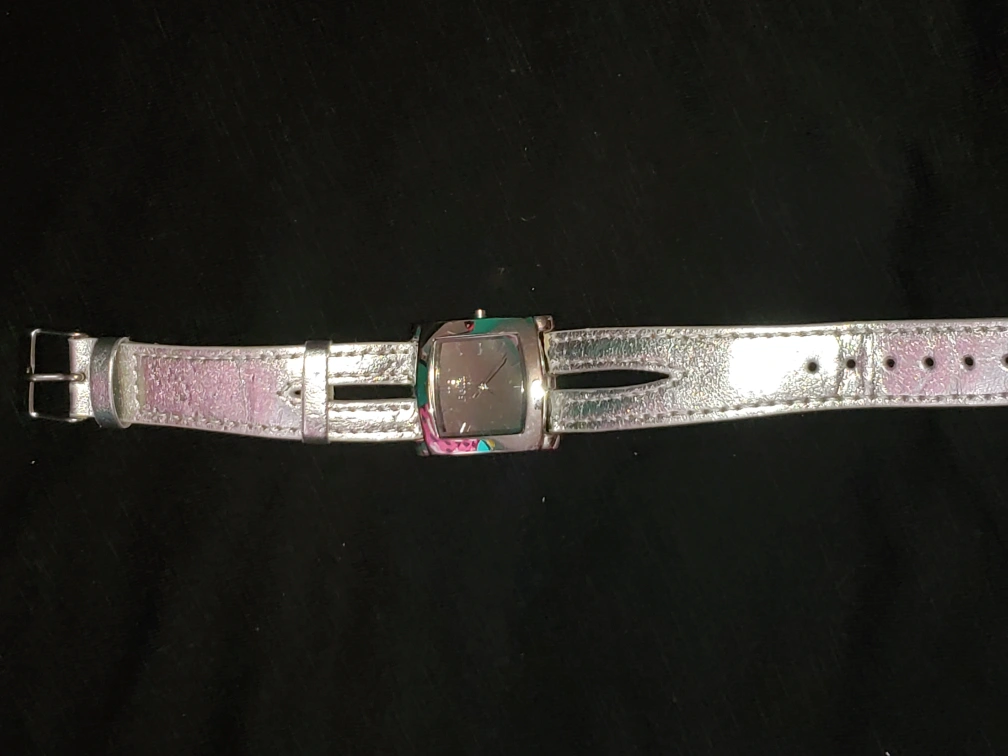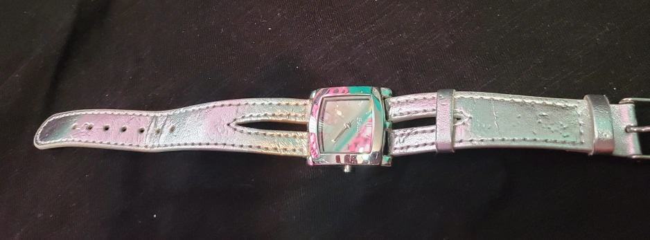 Women's watch. Silver coloured square face. Silver coloured leather band. Quartz movement.