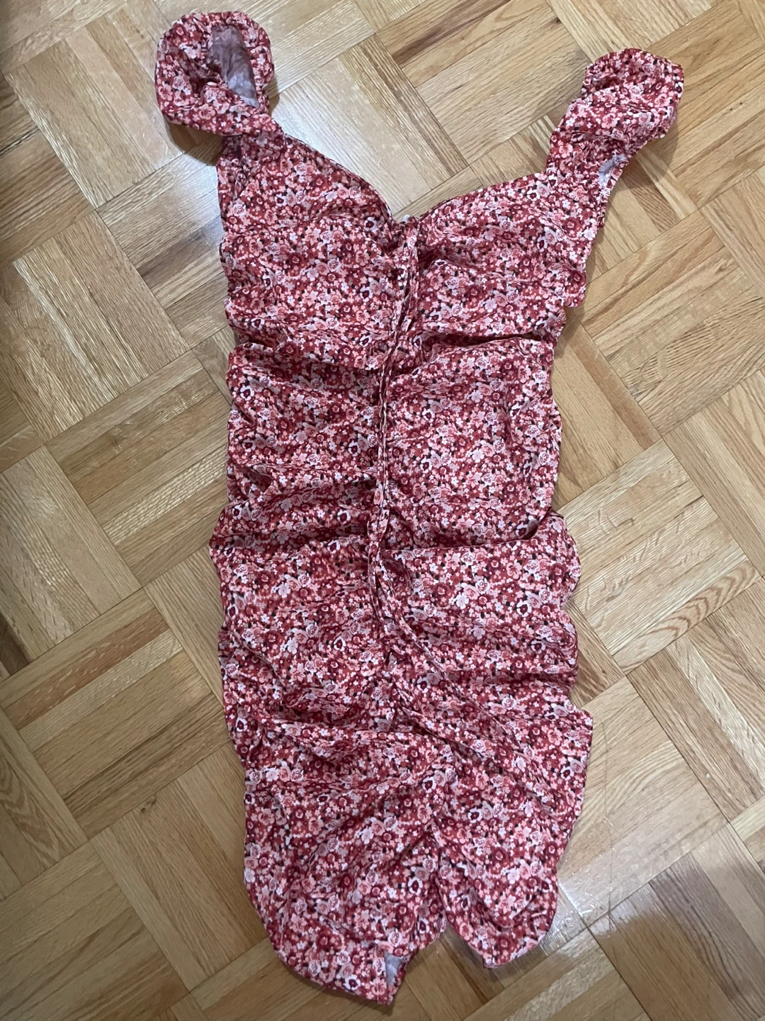 Selling a super cute floral mini dress! It features a ruched design that's really flattering.