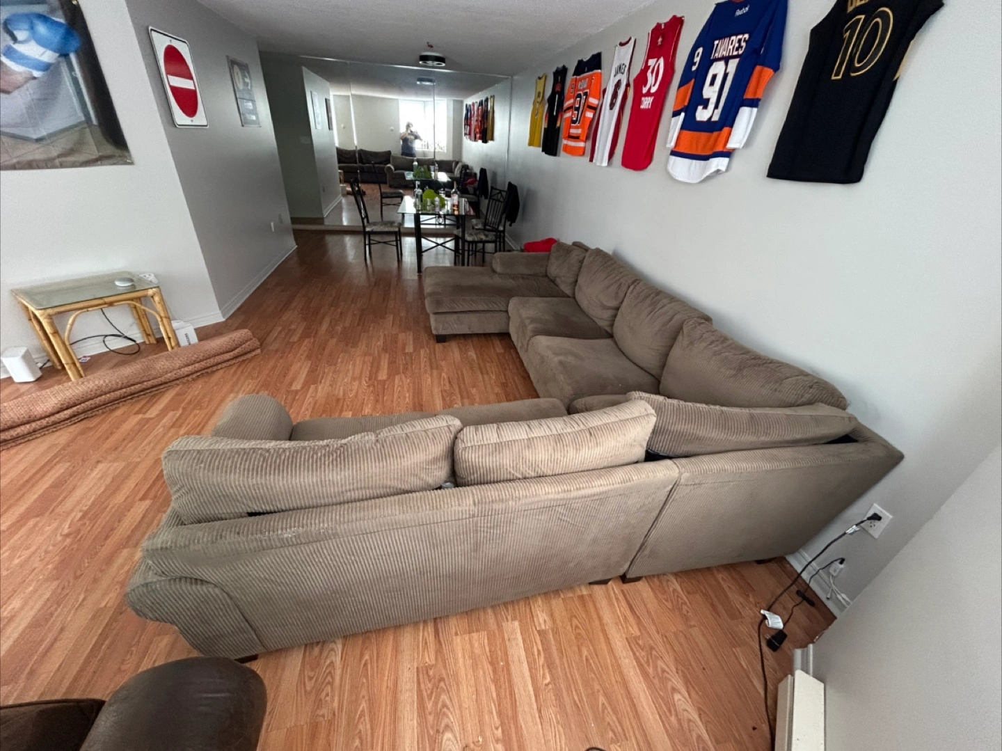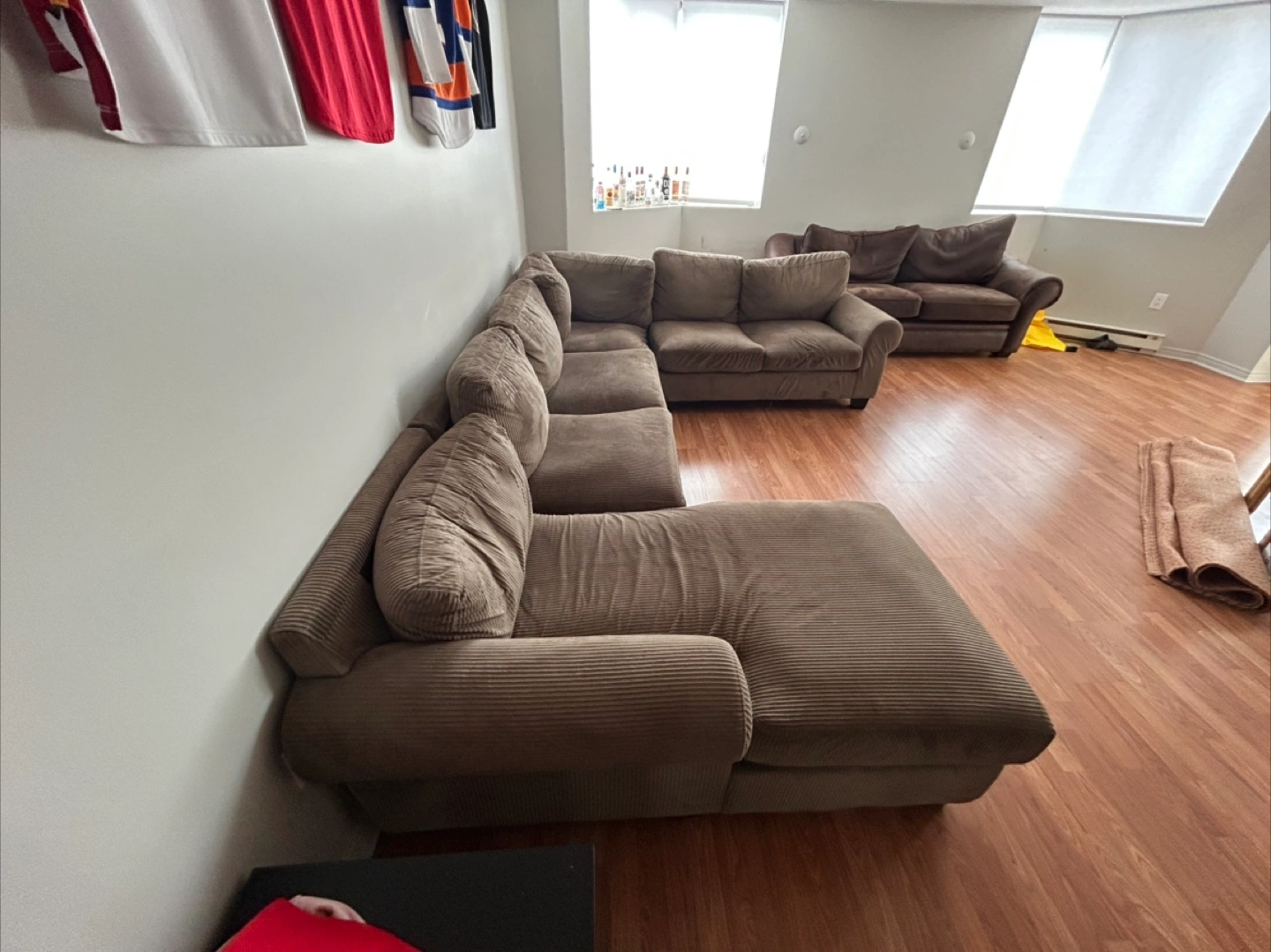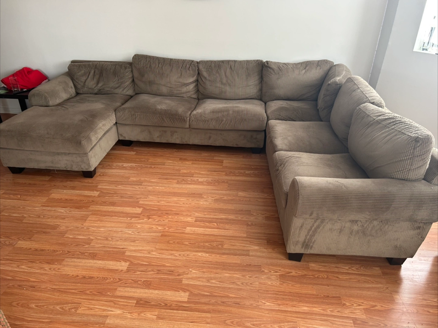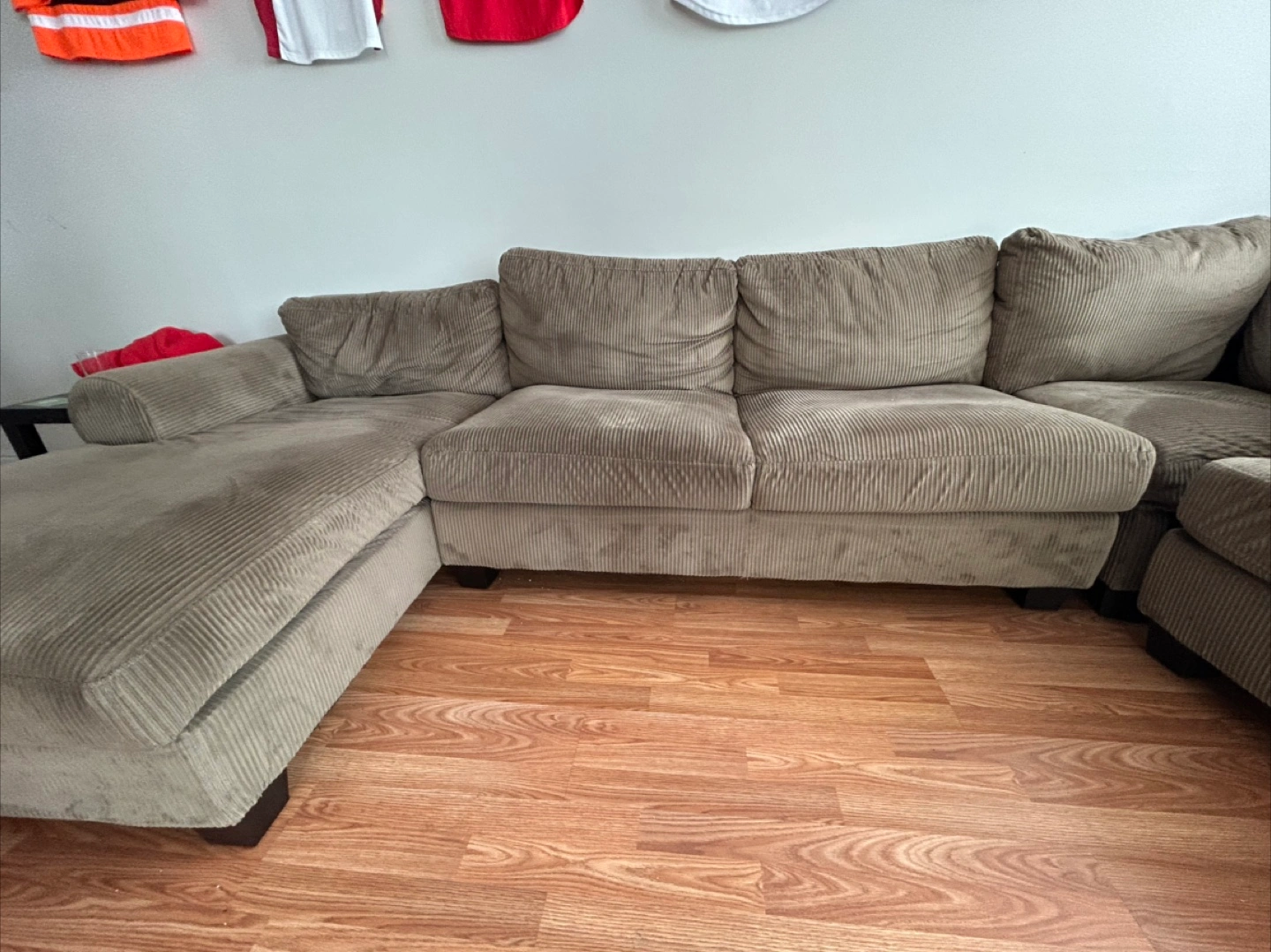 Spacious L-shaped sectional. Brown corduroy fabric. Good for large living rooms. Excellent condidition. No stains. Pet free and smoke free home. $500 or O.B.O