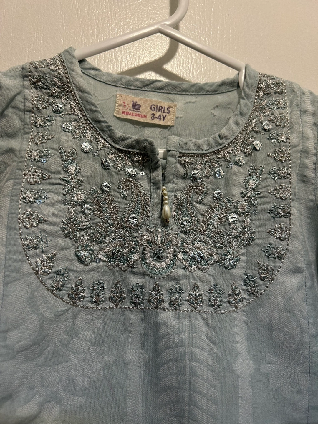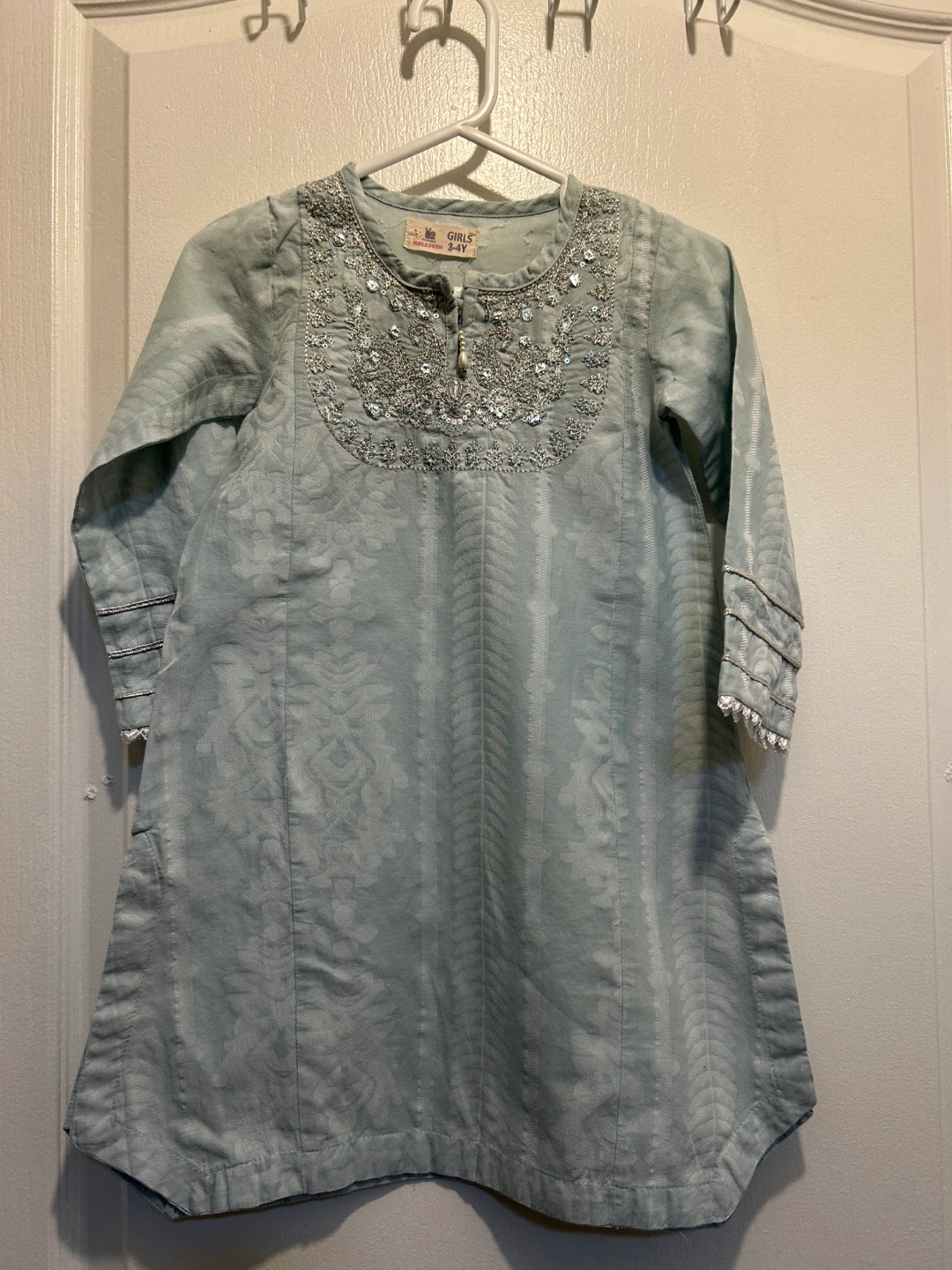 111Beautiful light blue kurta. Embroidered neckline detail. Full sleeves. Good condition. Size 3-4 years. Pick up Markham