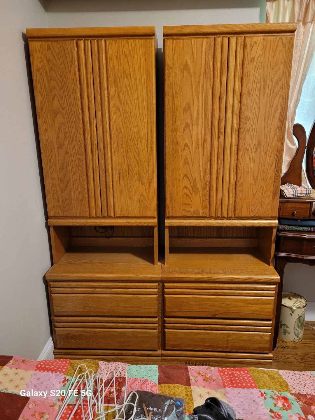 Two matching wooden cabinets. Each features two upper doors, an open shelf, and three drawers below. Oak wood construction. Light fixture included in upper shelf. use bed side tables. It can be suitable loaded into SUV car. first come first serve.