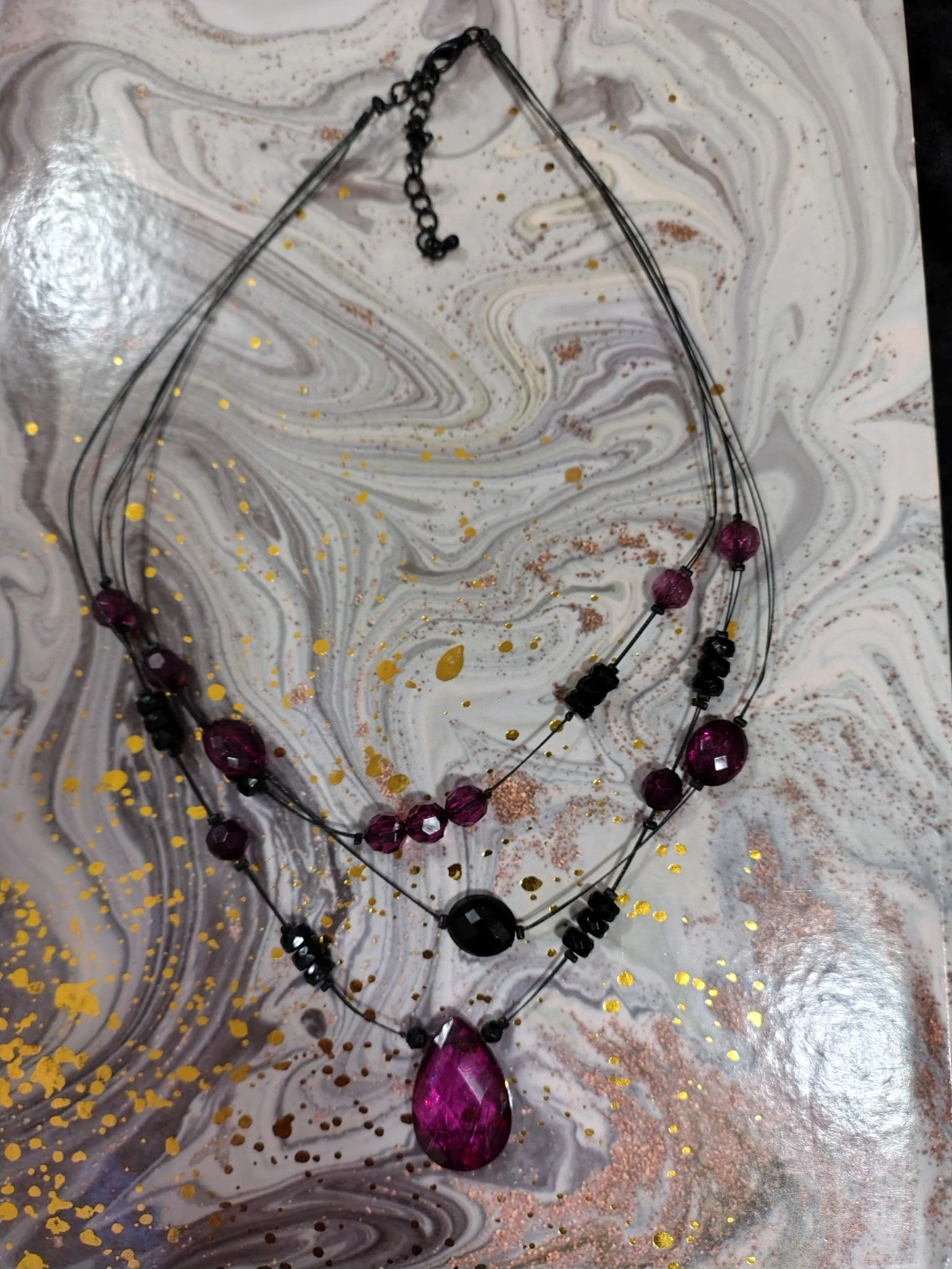 Multi-layered necklace features dark purple and black beads. A large teardrop pendant hangs from the bottom. Black cords and clasp.