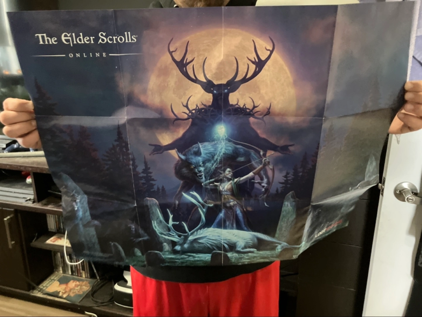 253Large folded poster. Features fantasy artwork. Depicts a werewolf, an archer, and a large stag. Great for any Elder Scrolls fan. Holes increases.