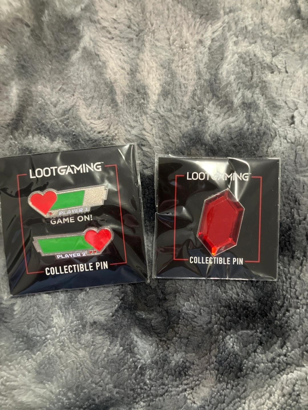 Two collectible enamel pins from LootGaming. One features a red heart and game controller design. The other is a red gem. New, never used.