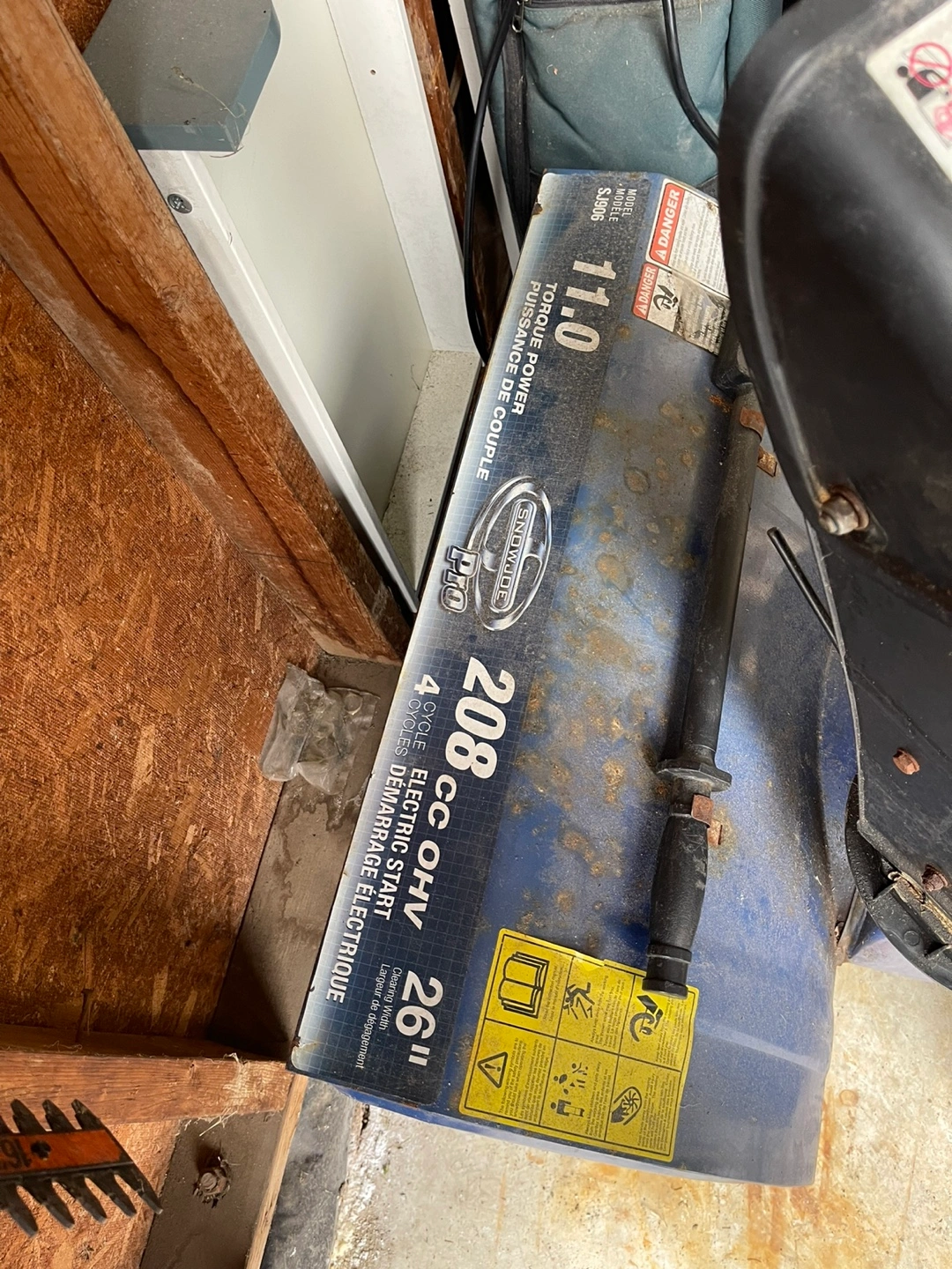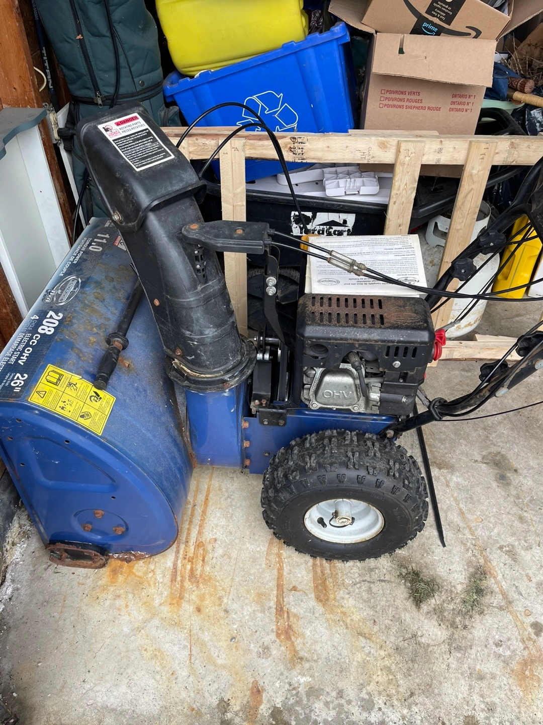 Yardworks 208cc 26" snowblower. Electric start. Four-cycle engine. Shows wear from use. Needs a service and belt replacement in the engine. Pick up Queen and Major William Sharpe