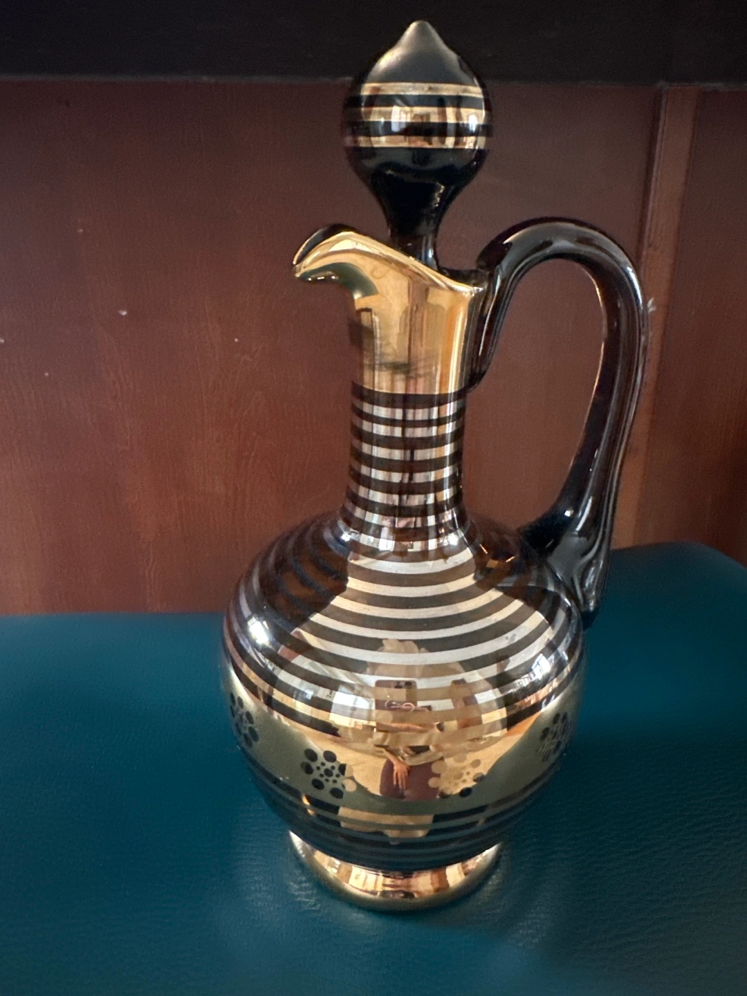 5Beautiful vintage decanter. Dark glass with gold accents. Striped design and floral detailing. Unique piece for your collection.