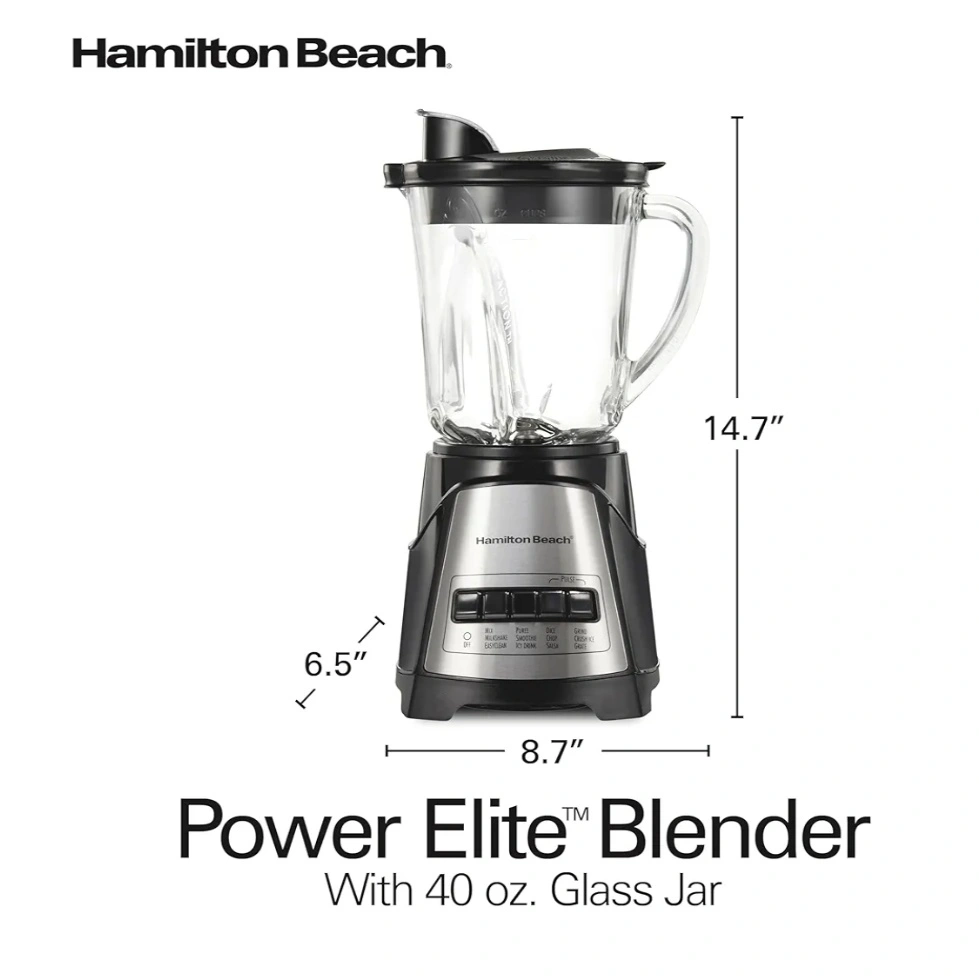 Hamilton Beach blender with 40 oz glass jar and multiple speed settings. Includes removable glass container, pour spout, and removable blade.