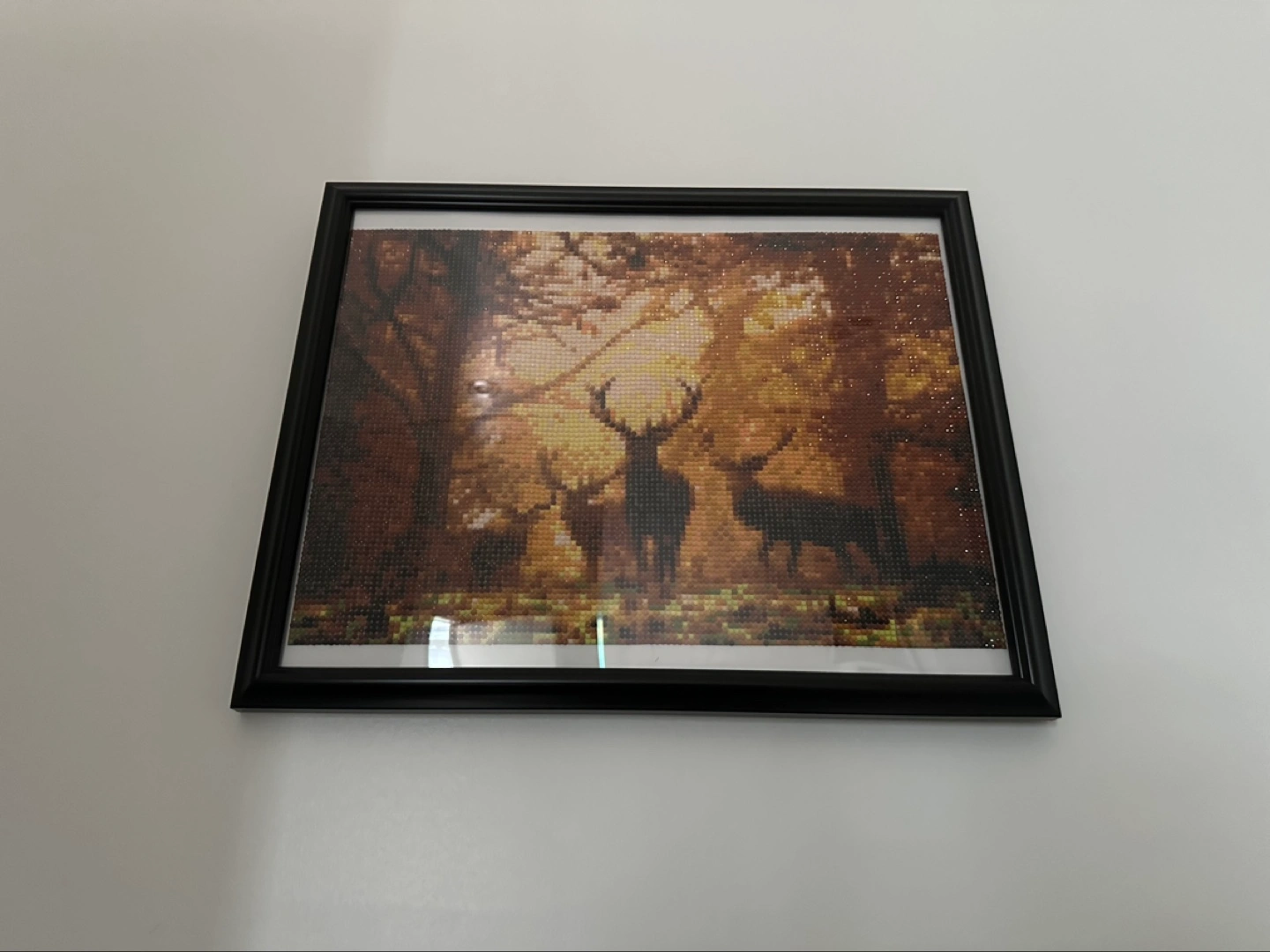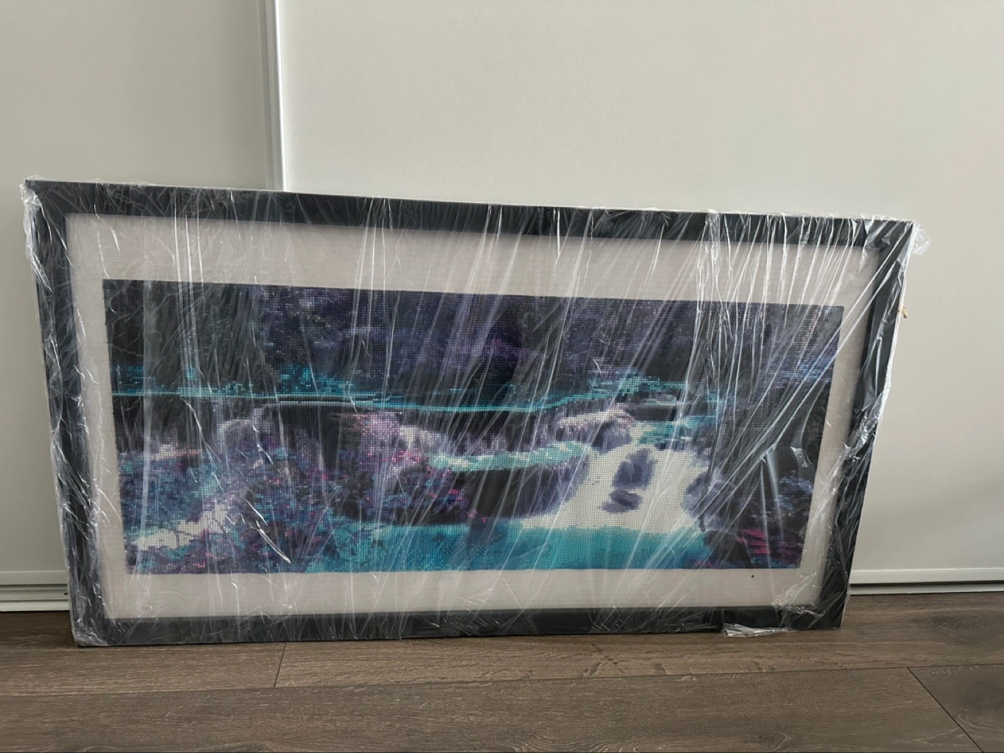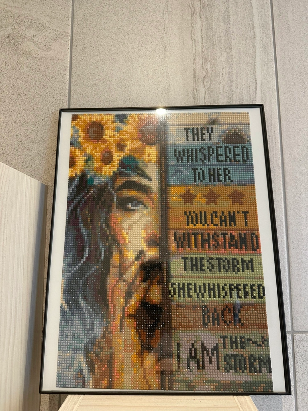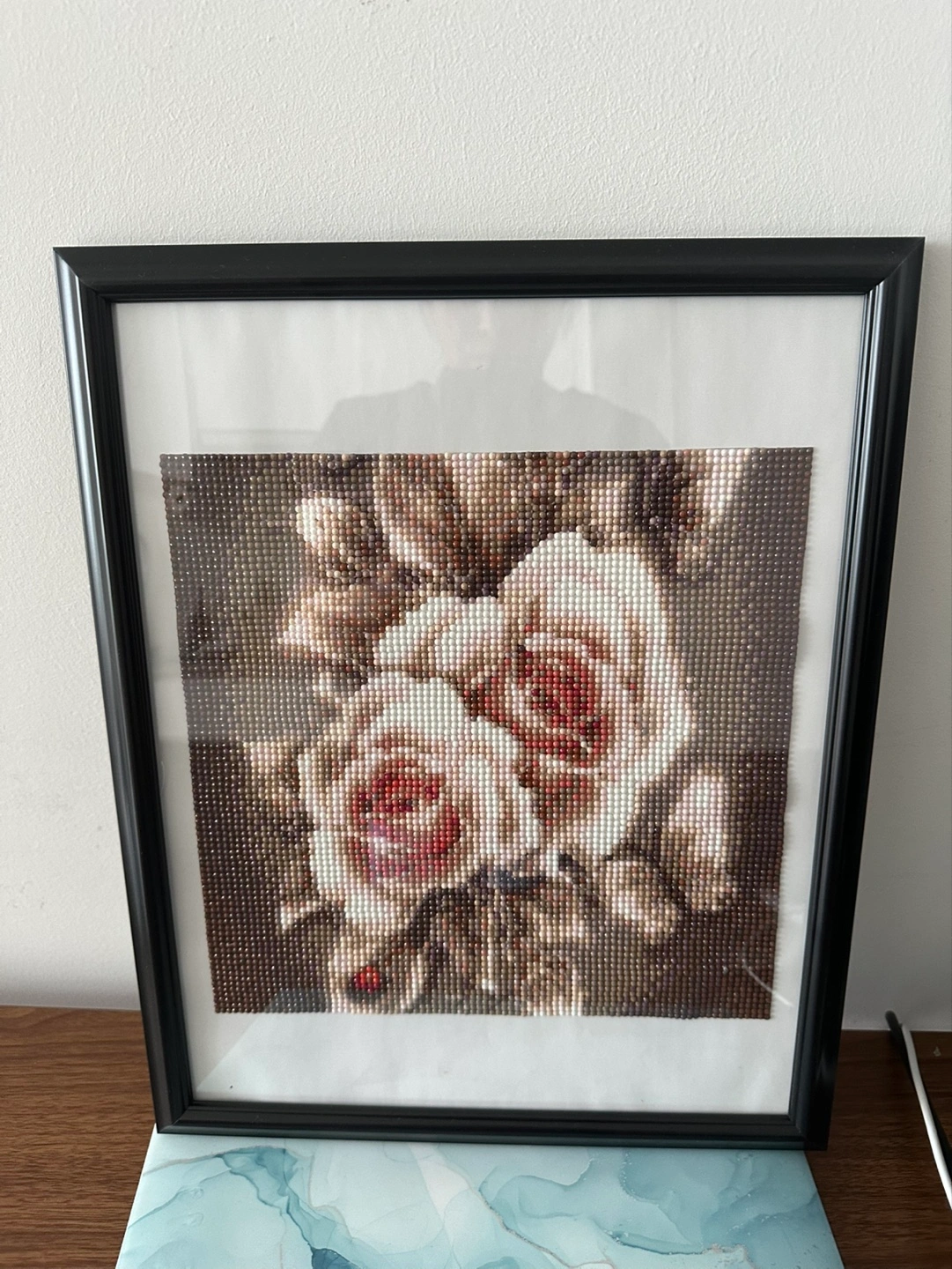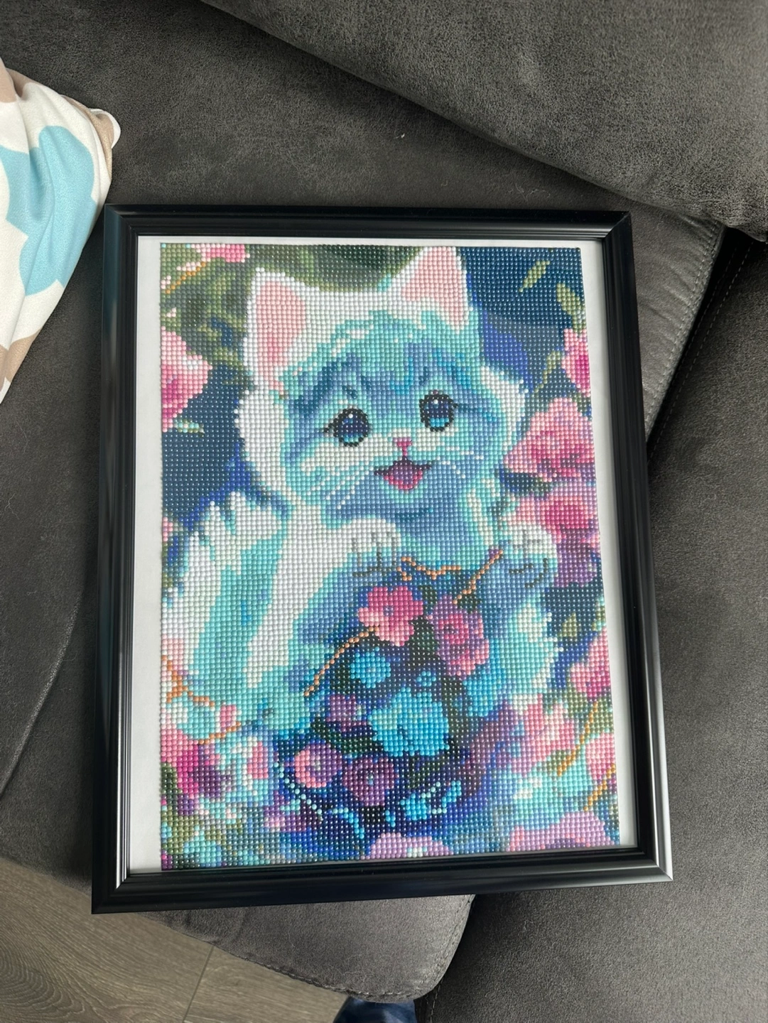 Five completed diamond painting kits. Various subjects including a woman with sunflowers, deer in a forest, a waterfall, a kitten, and roses. All framed in black frames. Great for home décor or gifts.