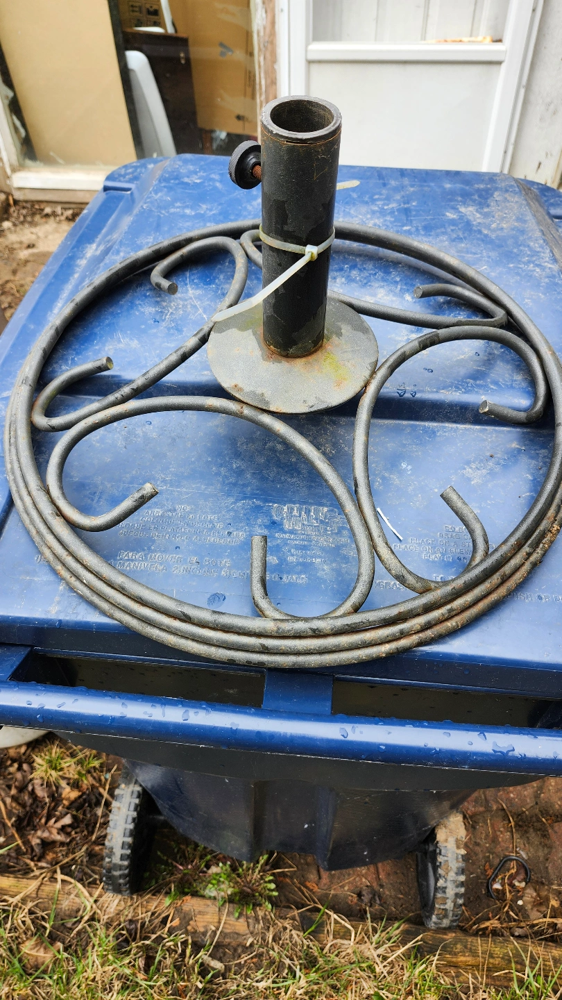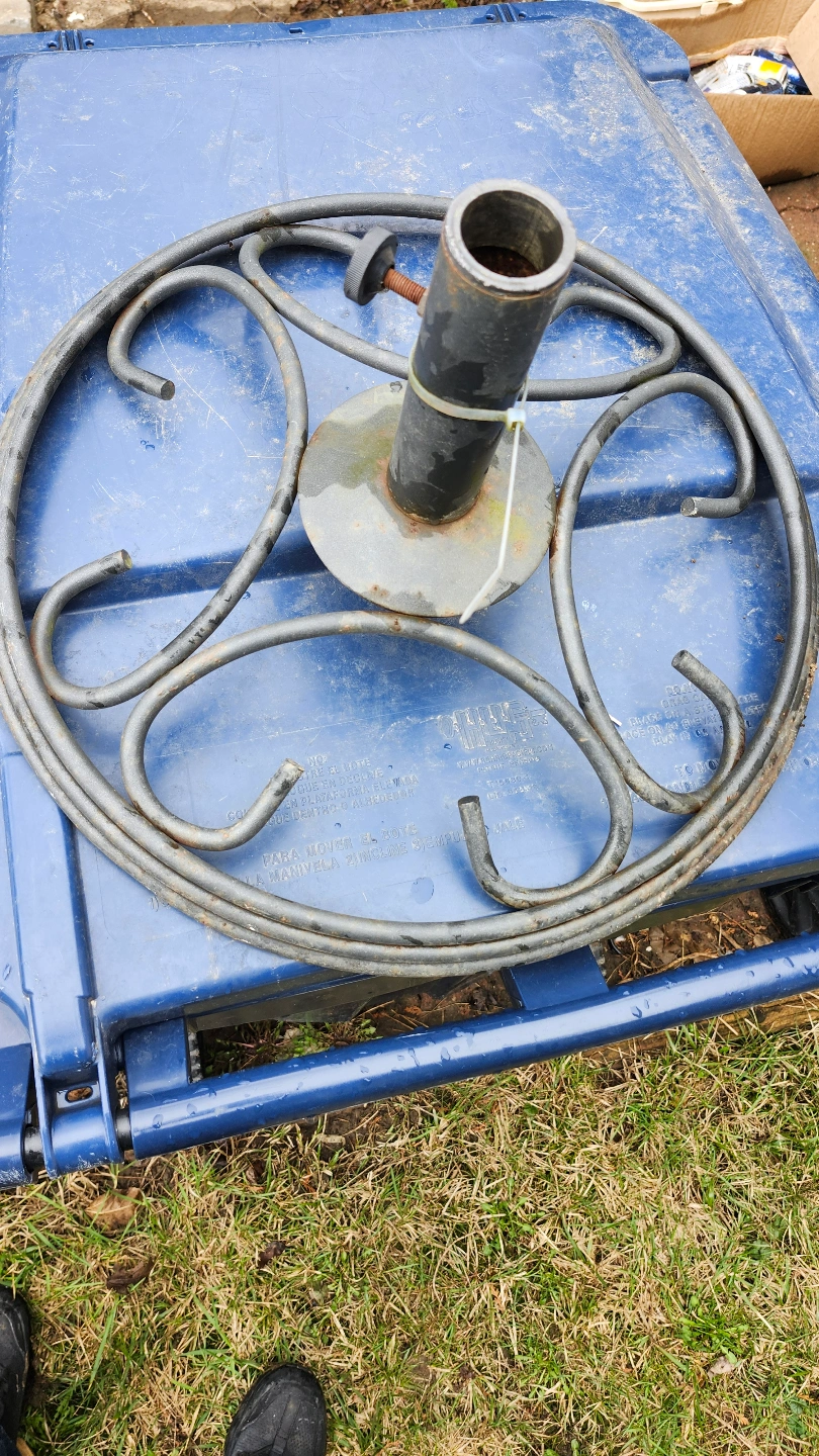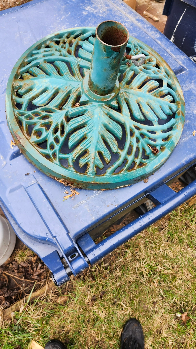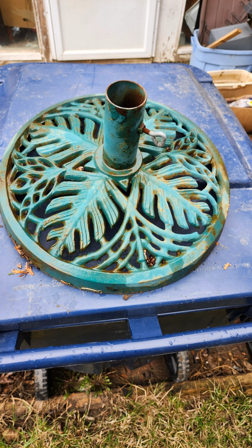 Two patio umbrella bases. One teal, leaf-design. One simple, round, metal frame. Both show wear from outdoor use. Good for smaller umbrellas. The teal one is heavier. $20 each.