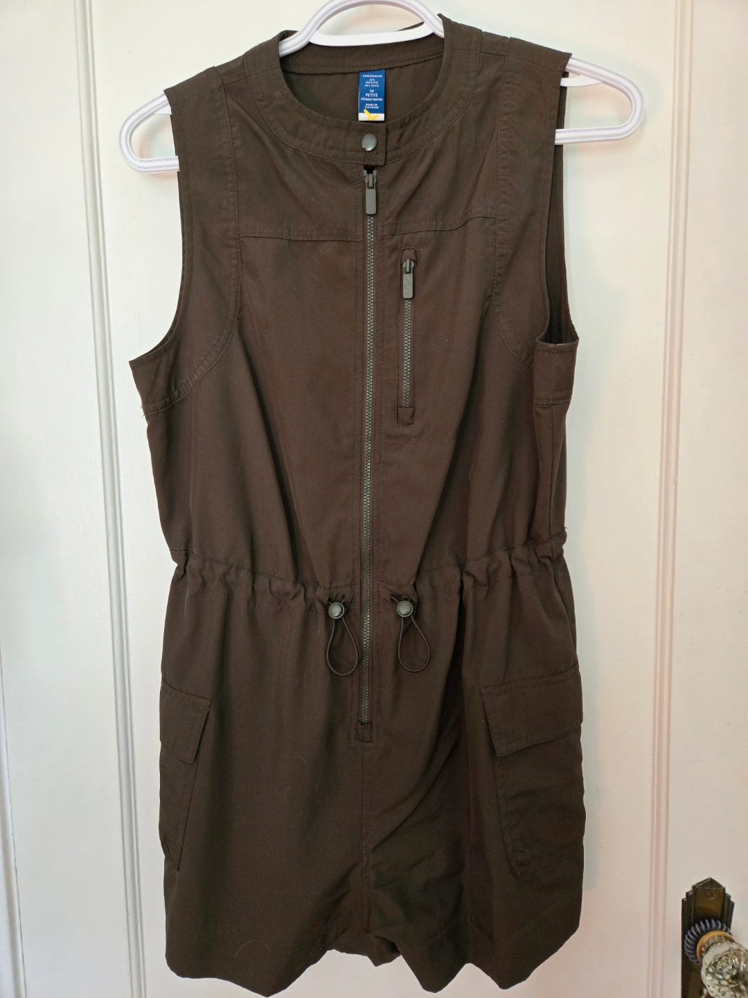 Dark brown/green sleeveless jumpsuit. Full zip closure. Drawstring waist. Multiple pockets. Great for casual wear.