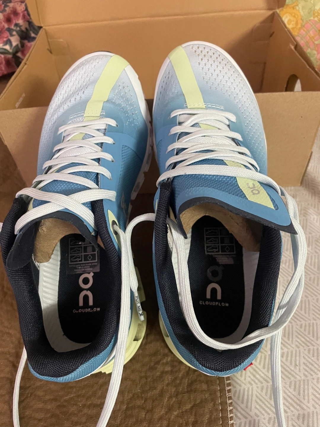 On Cloudflow running shoes. Women's size 6. Light blue colour. New in box. Niagara | Meadow colourway.pick up Markham and Lawrence