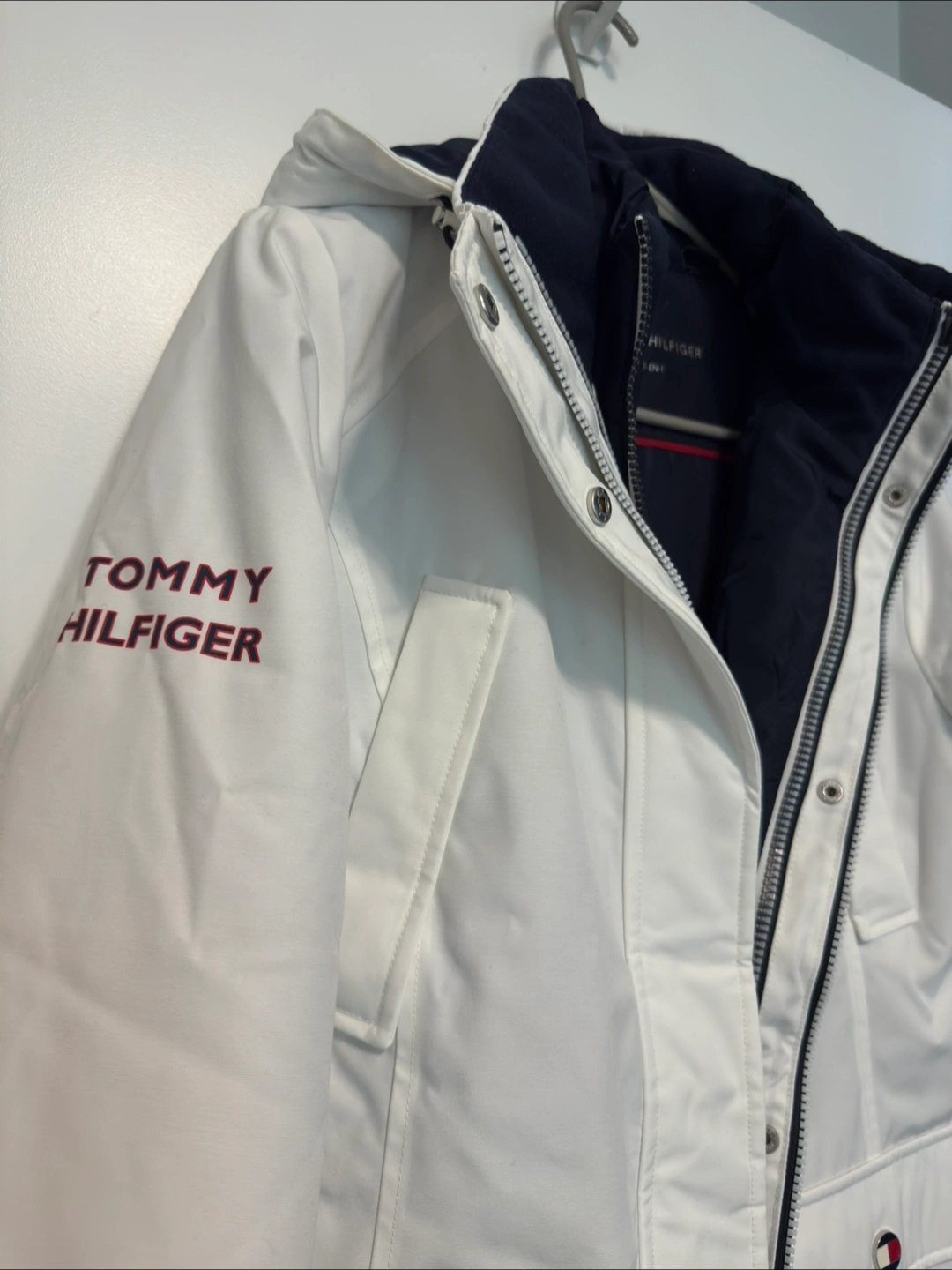 Women's white hooded jacket. Size medium. Features Tommy Hilfiger branding. Long sleeves, pockets, and a drawstring waist. 3-in-1. Brand new.