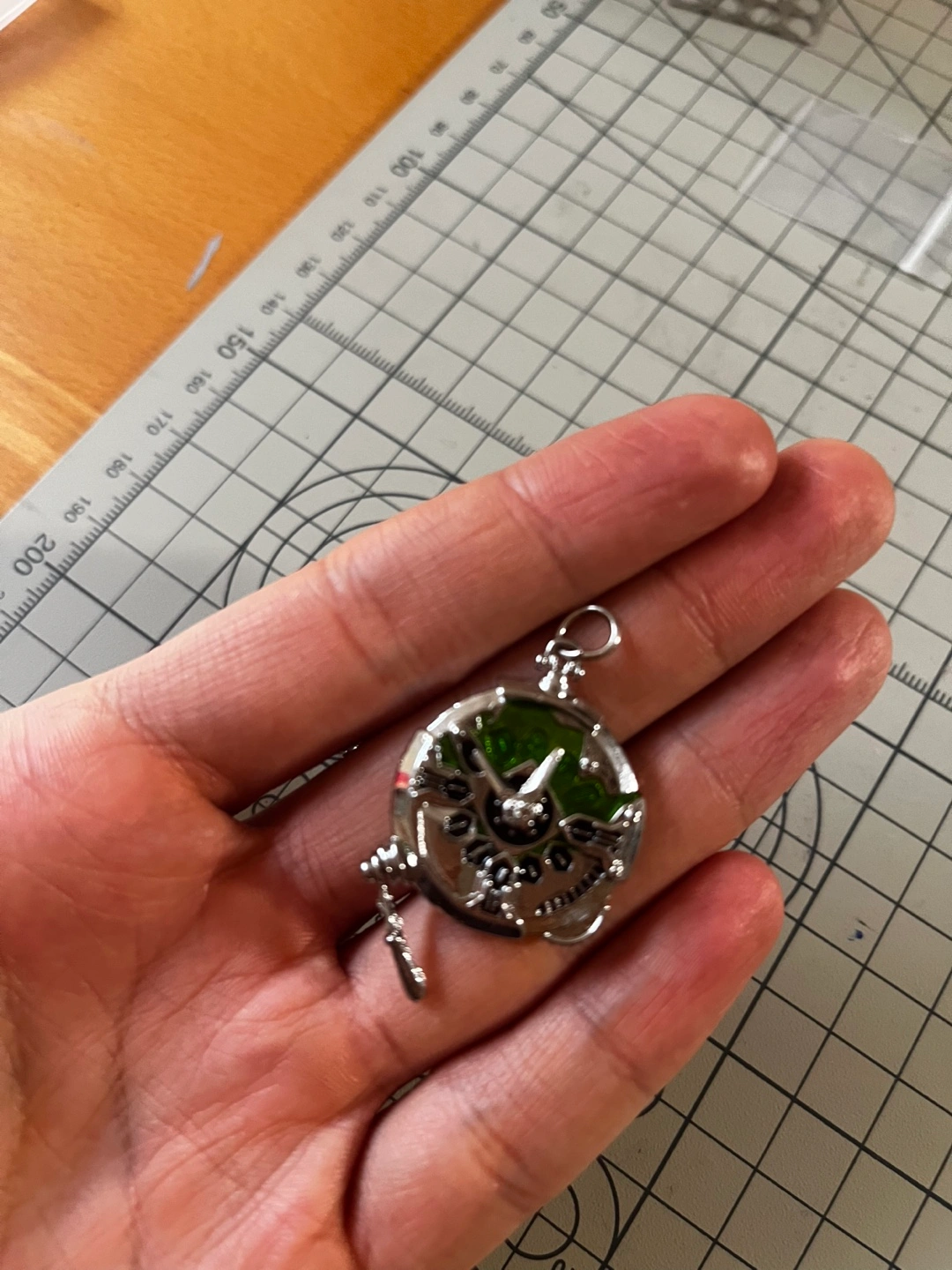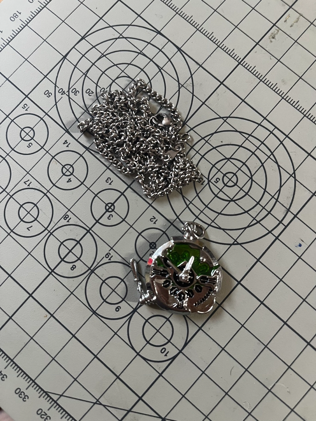 Silver-toned metal necklace featuring a detailed circular pendant with green accents. Intricate design, possibly inspired by gears or clockwork. Comes with a delicate chain. Great statement piece. Not gears movable.