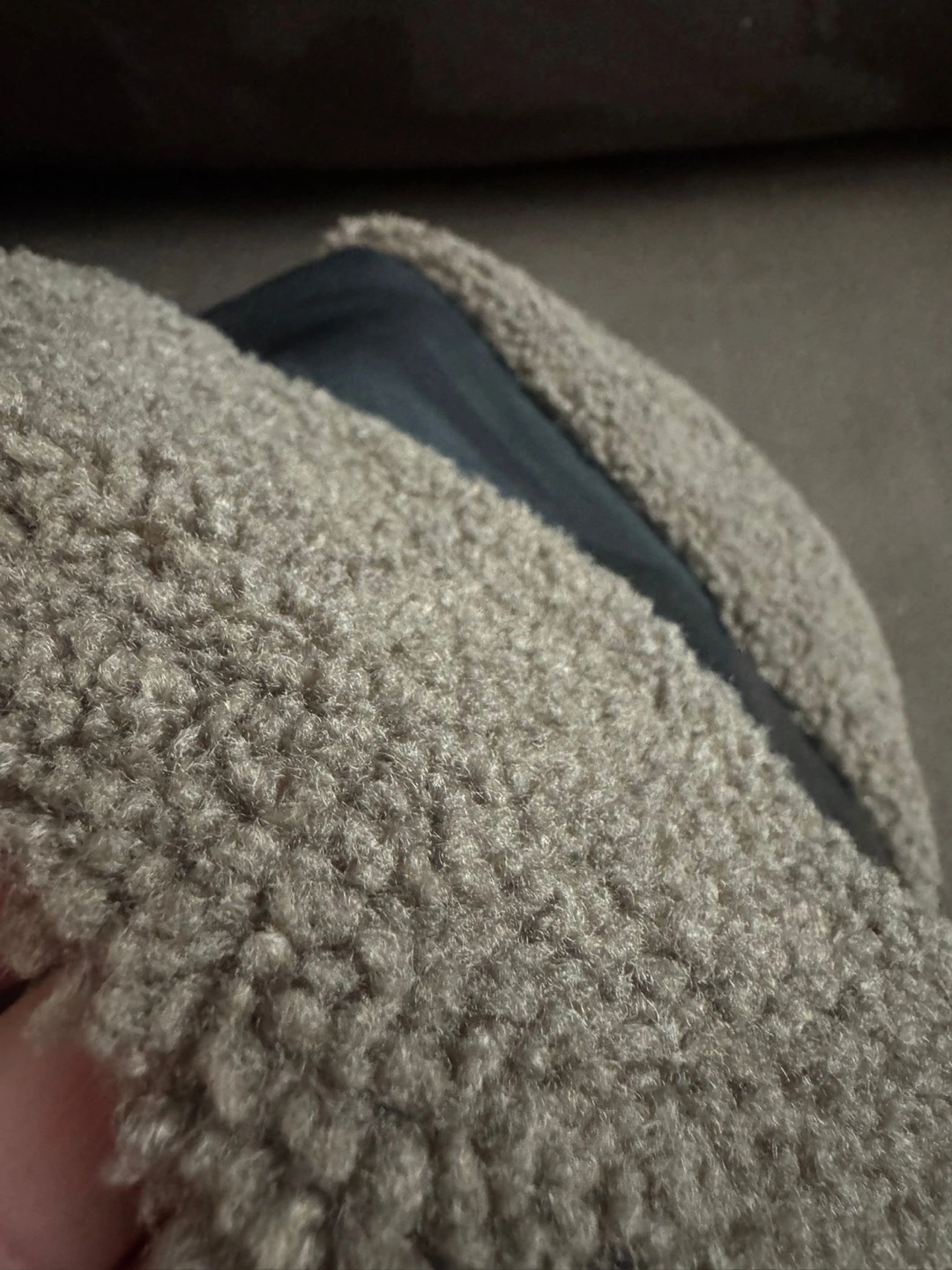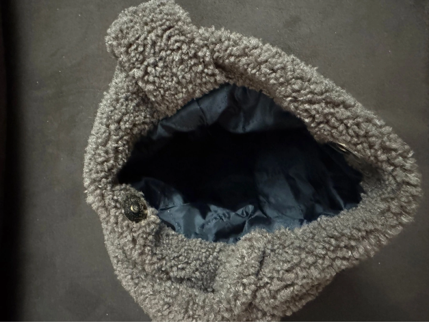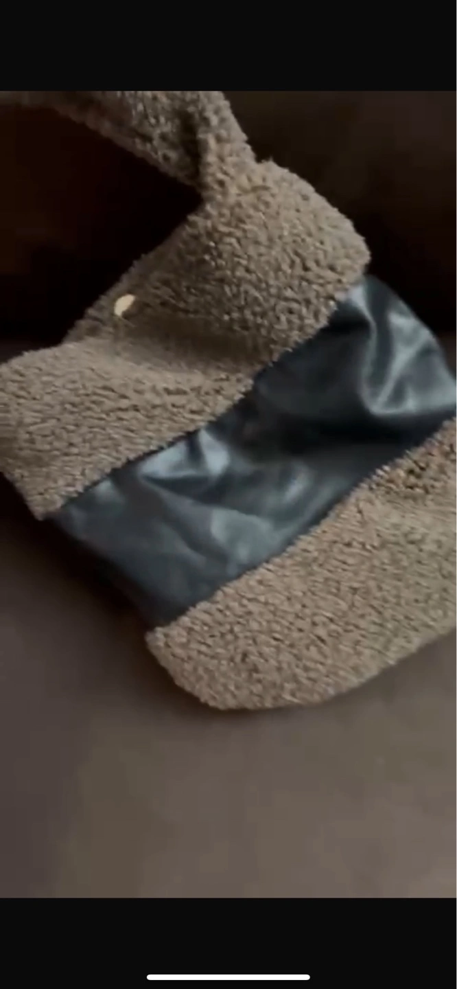 Adorable taupe coloured shoulder bag. Features a fuzzy exterior and a black leather-like accent. Top handle and magnetic closure. Perfect for everyday use.