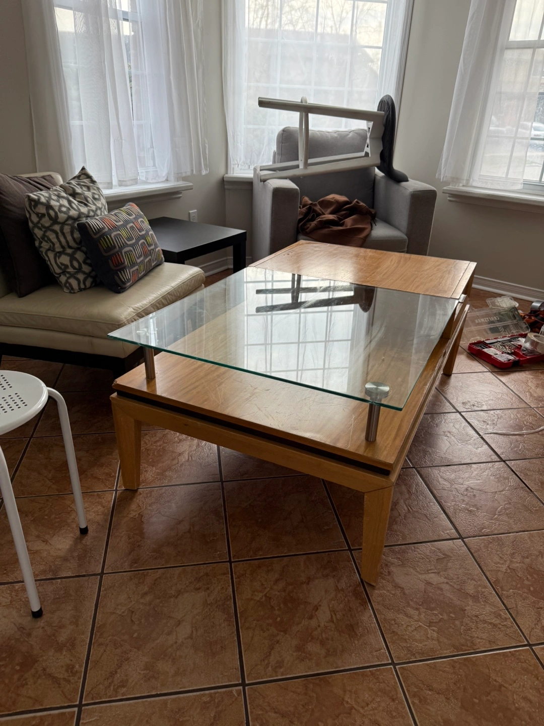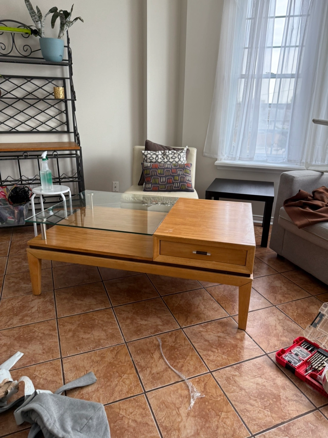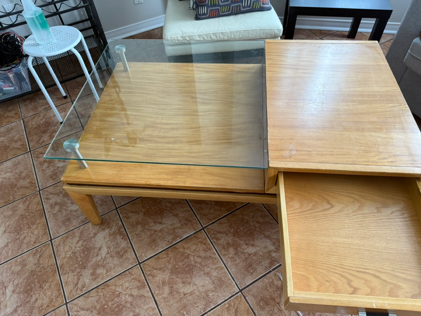 Unique coffee table. Features a large glass top, a spacious wooden drawer, and a sleek design. Solid wood construction. Perfect for modern living rooms. its a bit scratched but in good condition