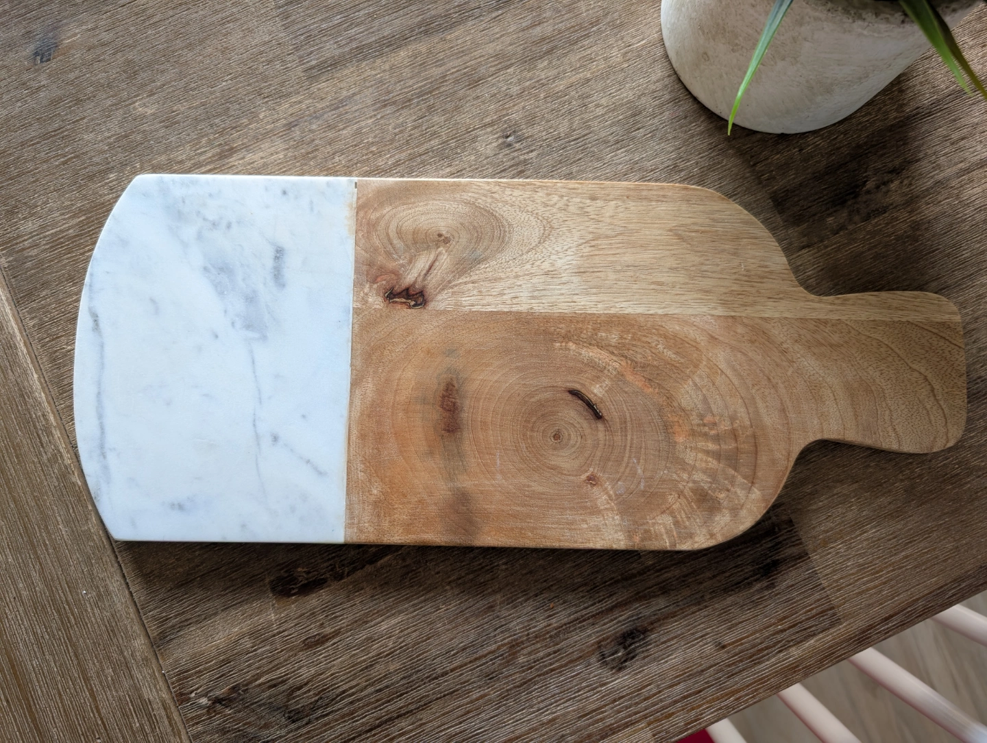 Wood and marble serving board. Great for cheese, charcuterie, or appetizers. Measures approximately 17 inches long.