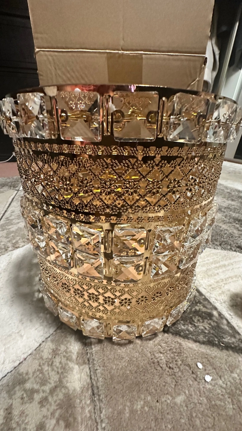 Elegant gold-toned metal wastebasket and tissue box set. Features clear crystal accents. Perfect for adding a touch of glamour to any room.