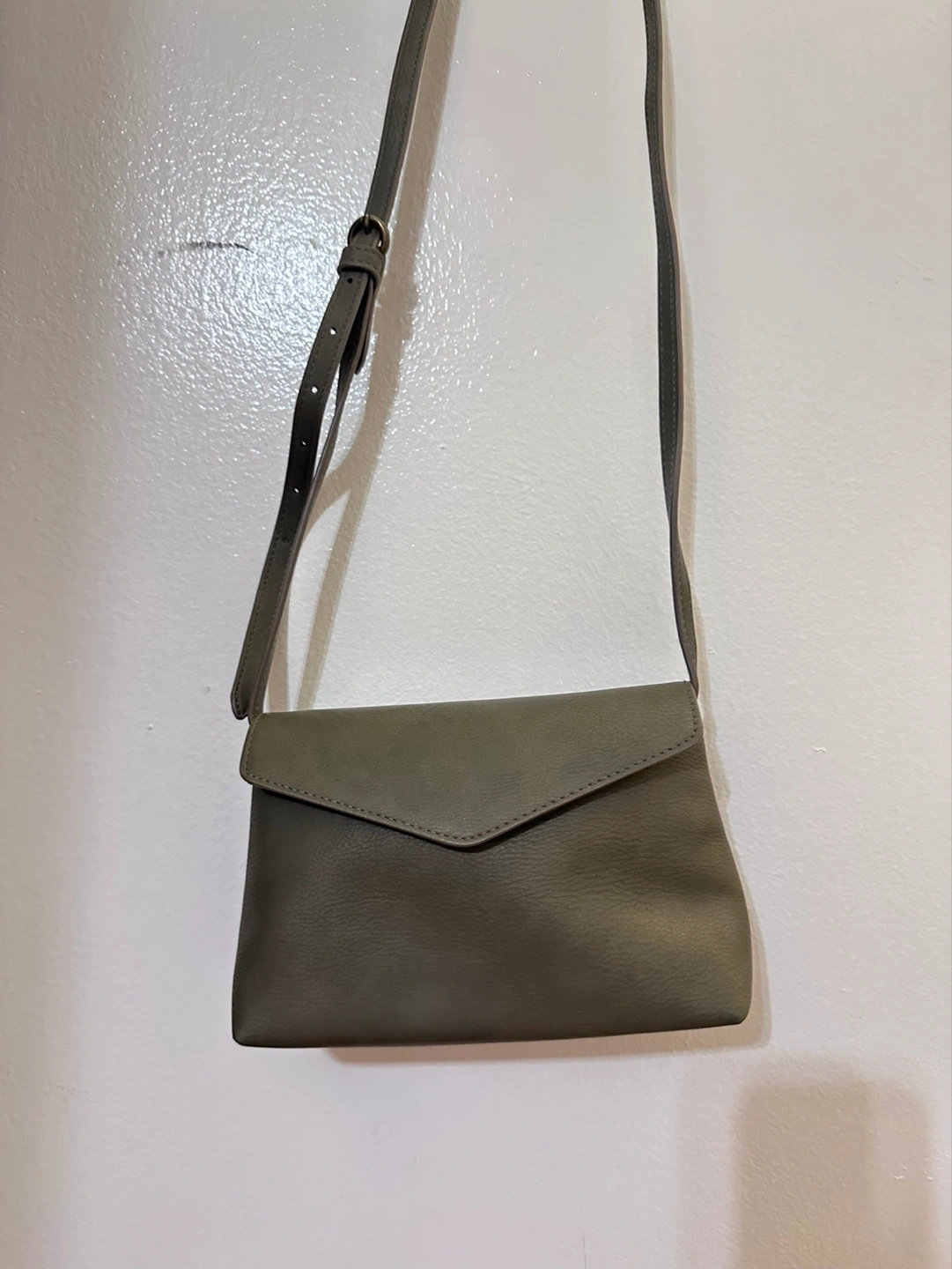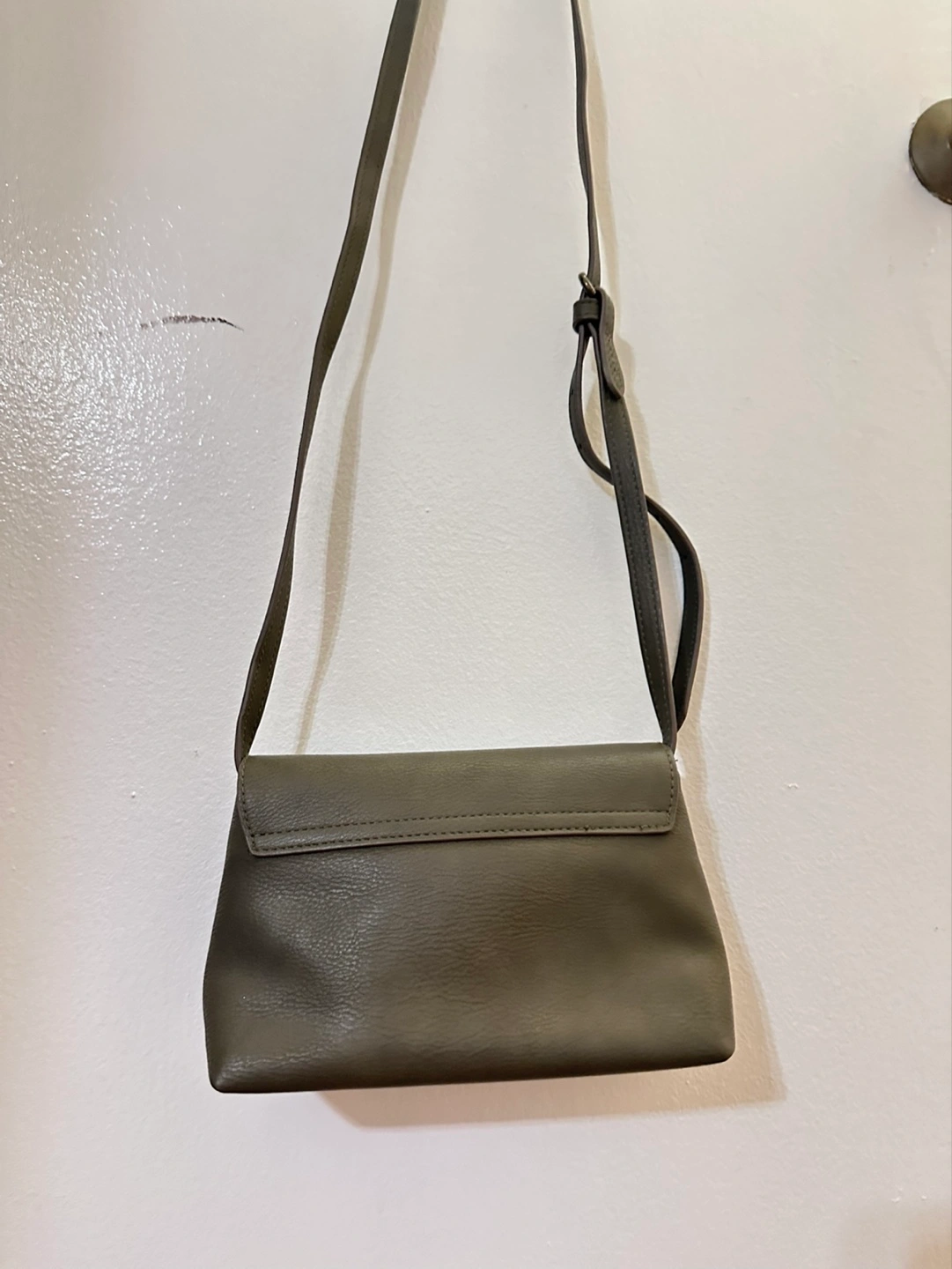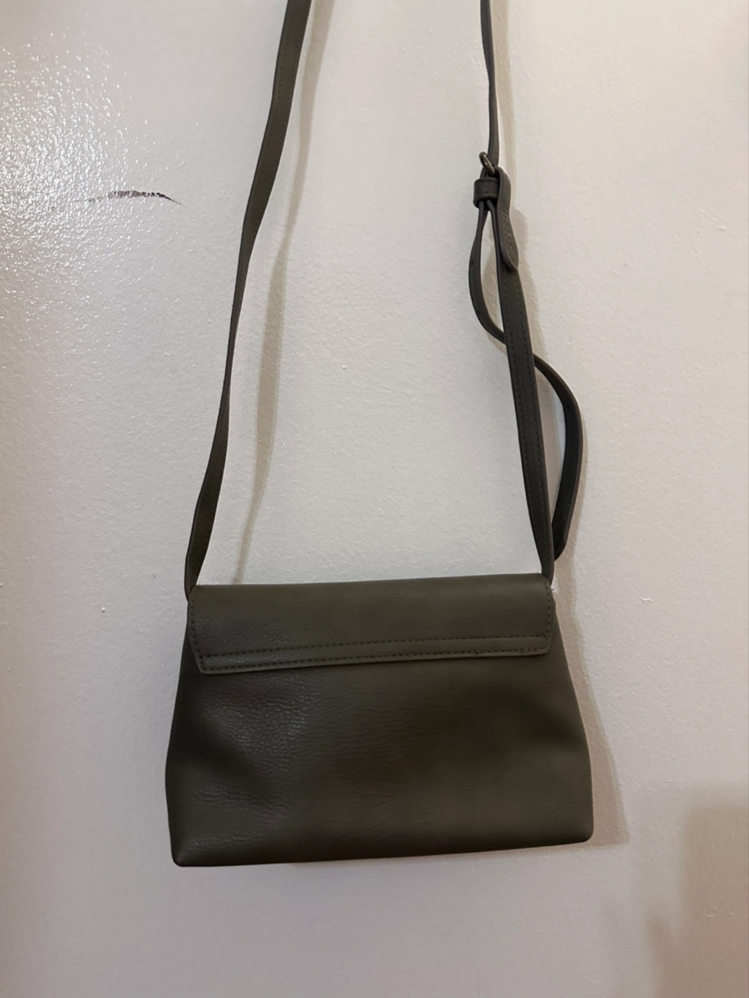 210Small crossbody bag. Olive green. Adjustable strap. Flap closure. Interior zipper pocket. Good condition.