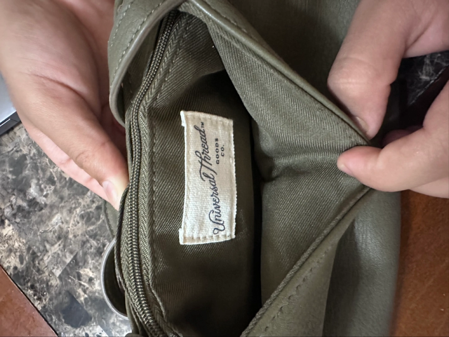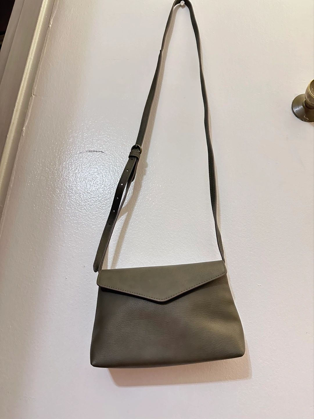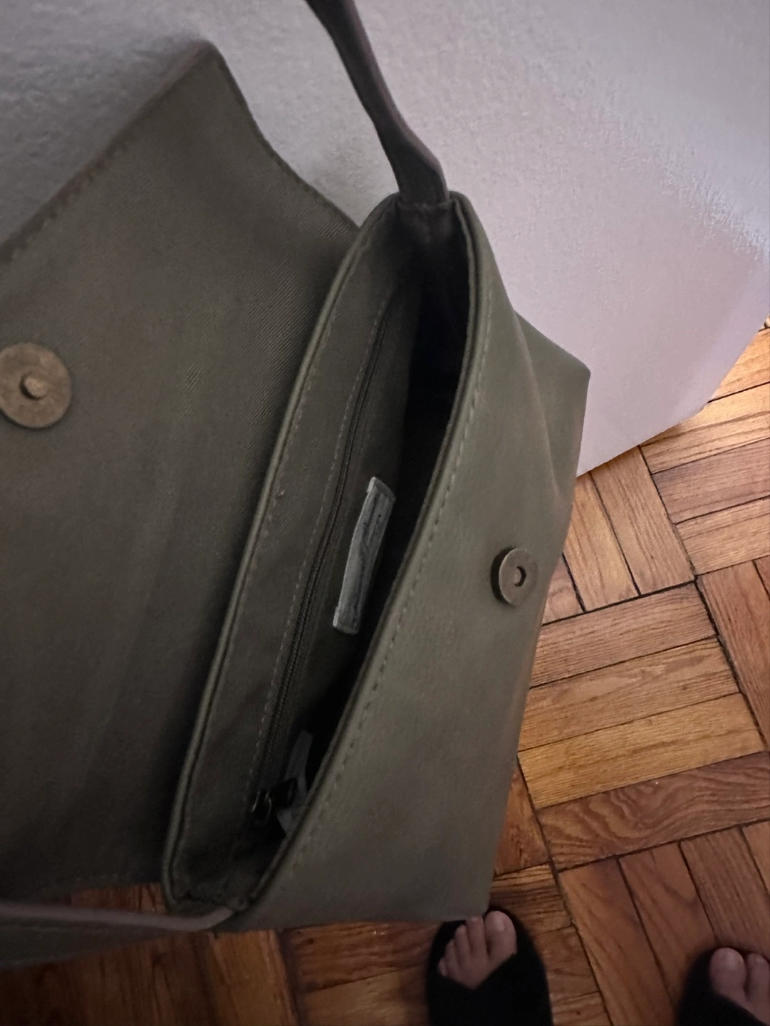 210Small crossbody bag. Olive green. Adjustable strap. Flap closure. Interior zipper pocket. Good condition.