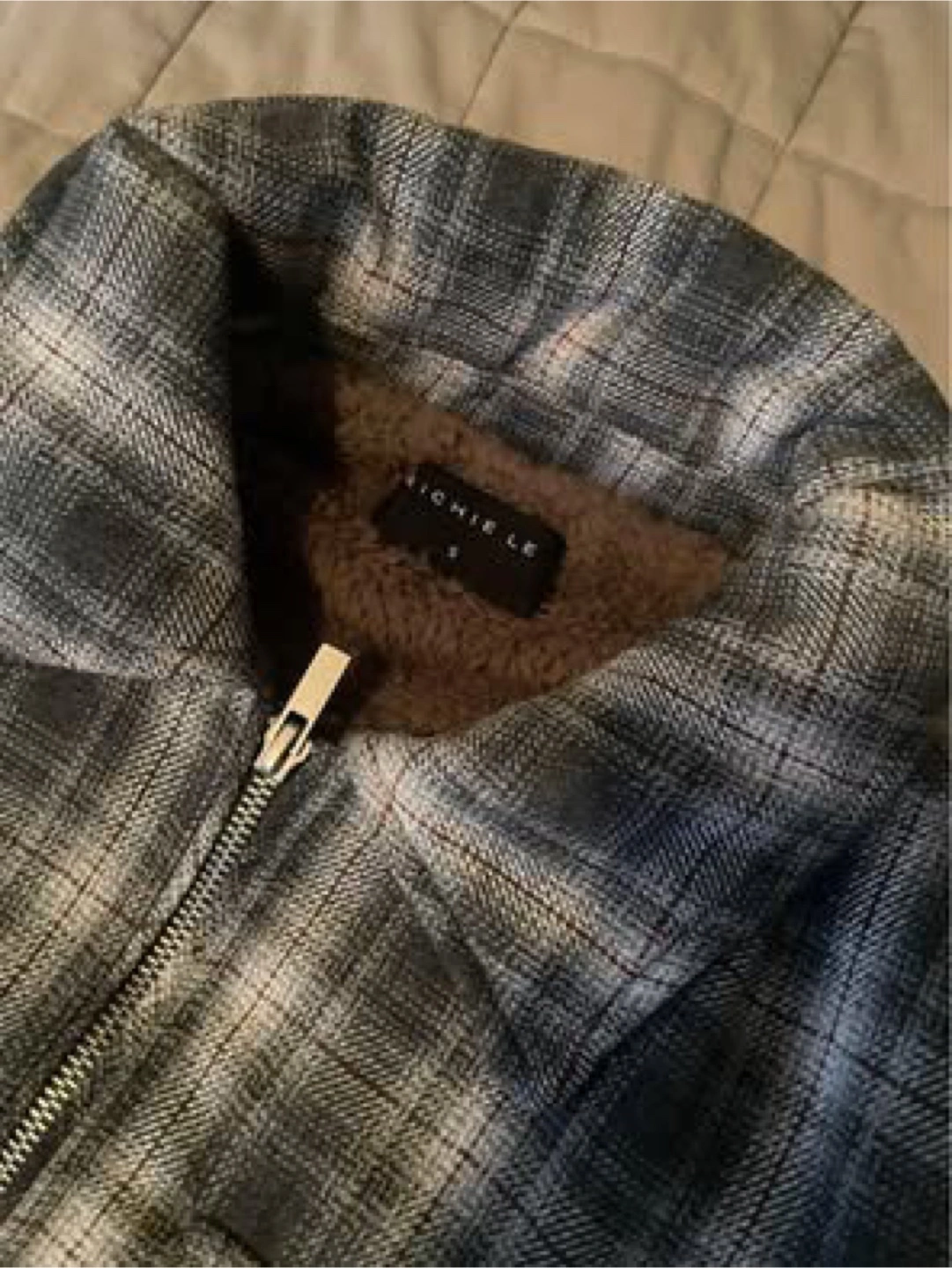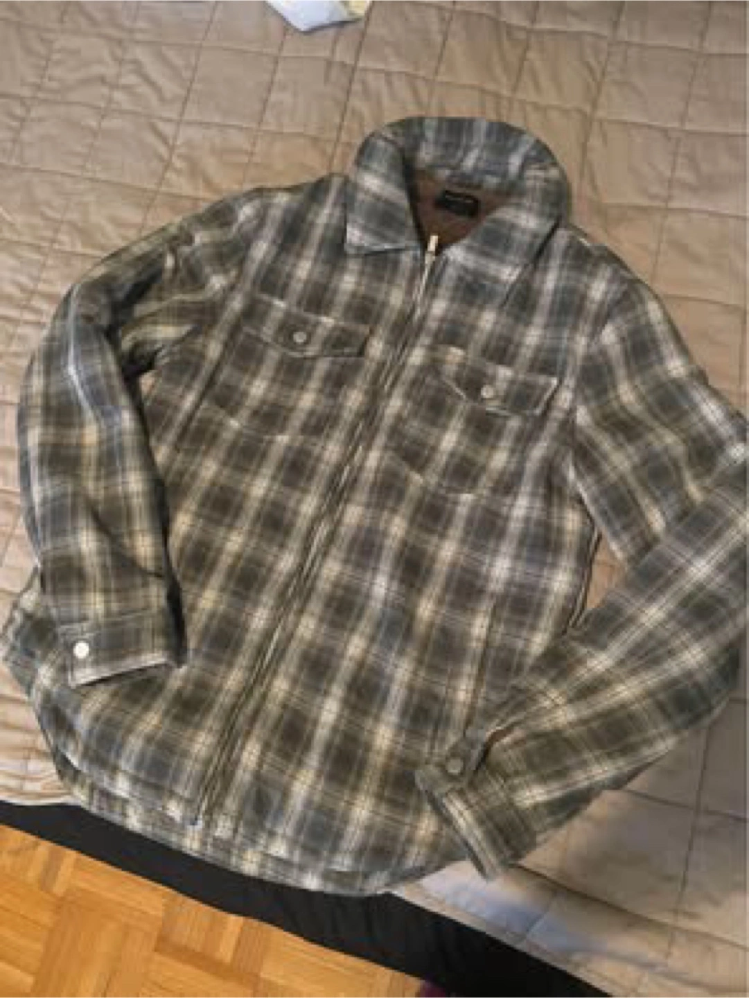 Men's size small flannel-lined jacket. Grey and white plaid pattern. Zip-up front. Two flap pockets. Soft fleece lining. Excellent for colder weather.
