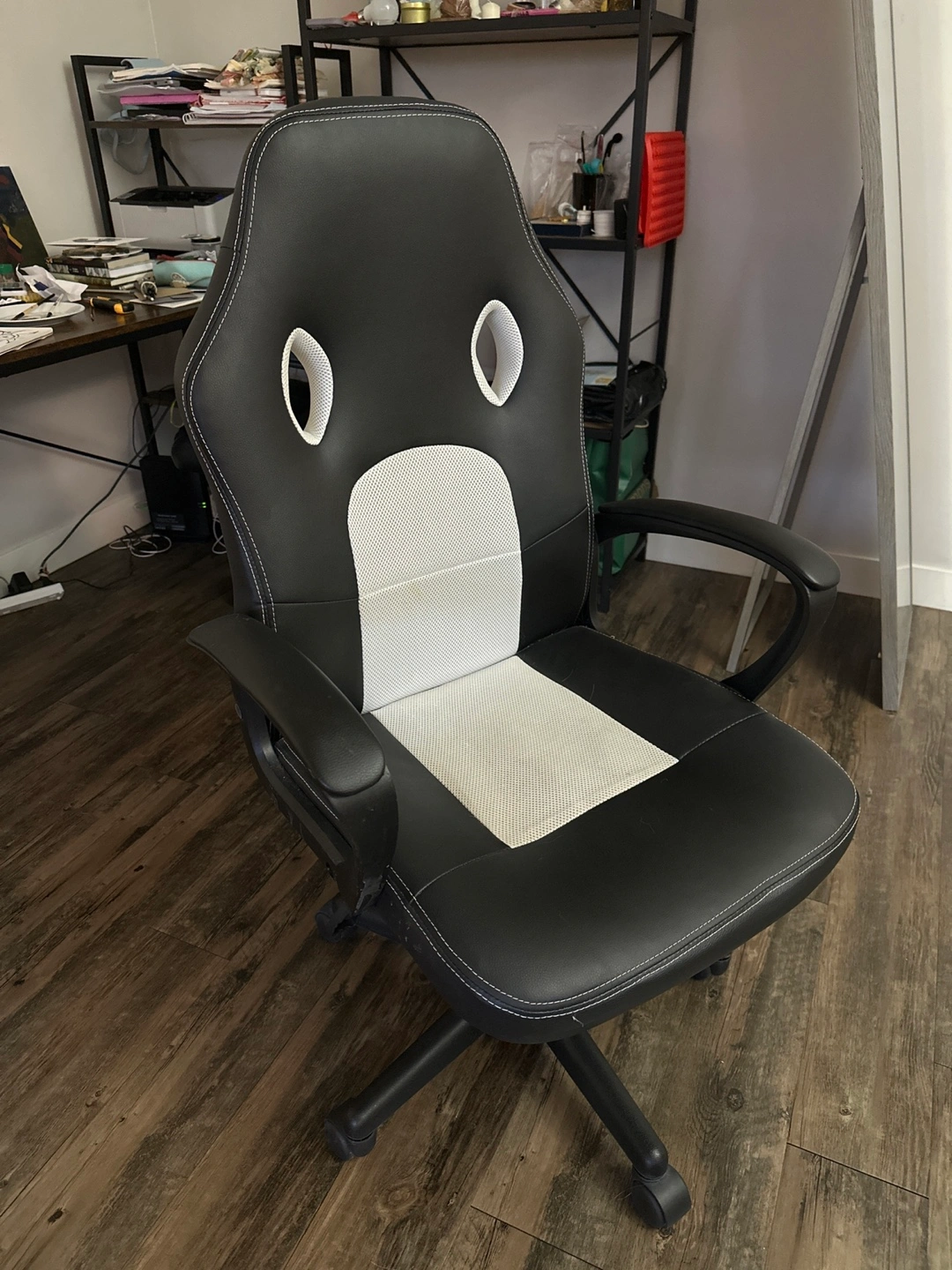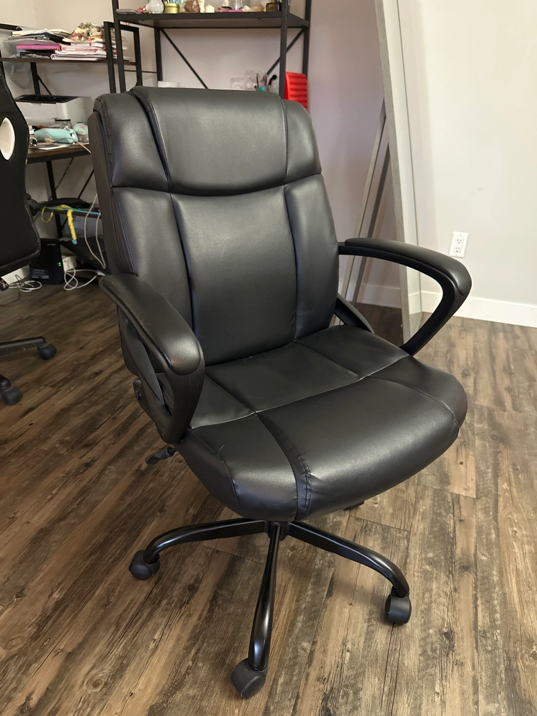 Comfortable office chair. Black and white design. Features include armrests and rolling wheels. Suitable for home or office use.